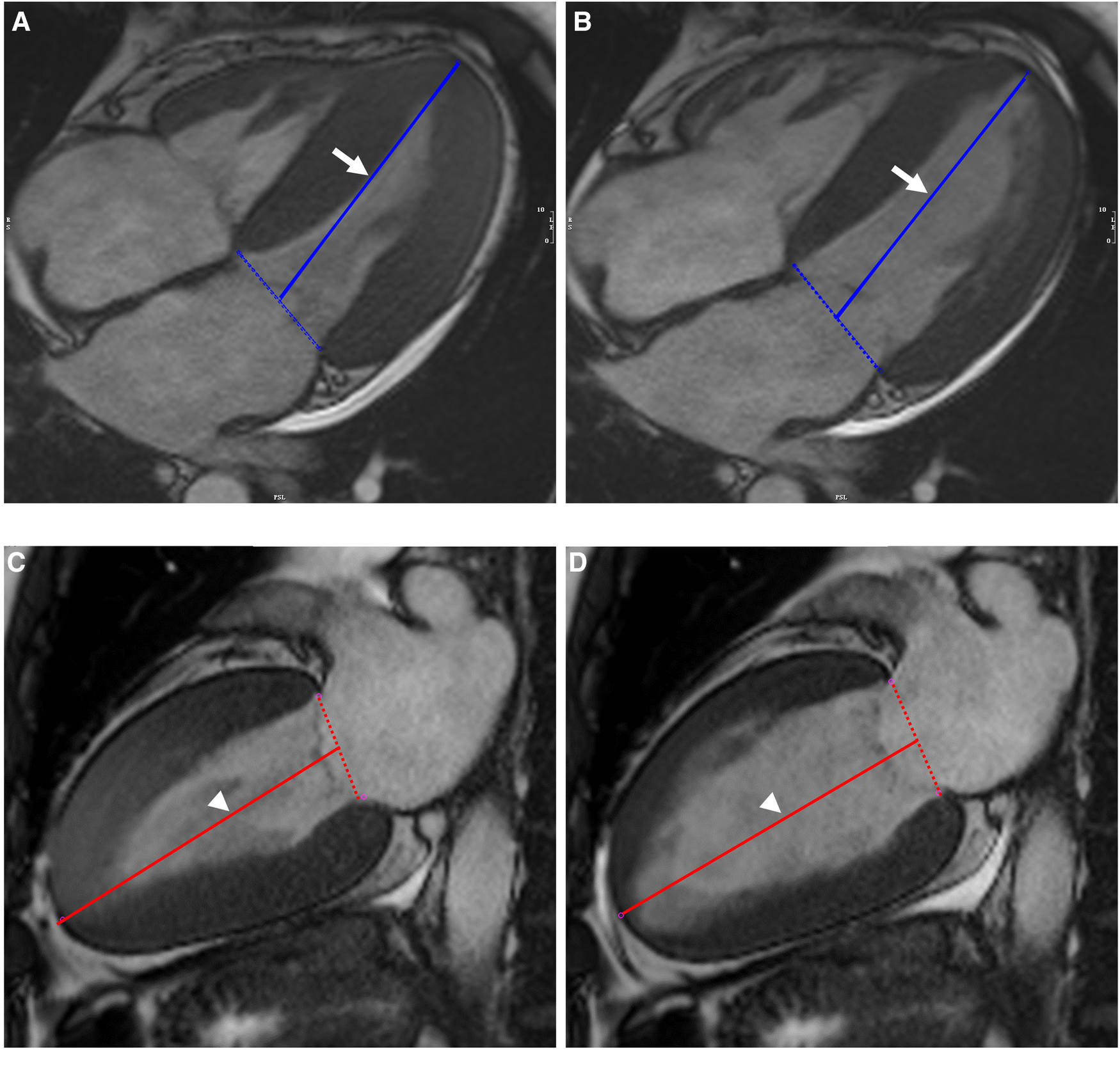 Illustration of biplanar assessment of LV LAS in an AL-CA patient on MR cine images: the solid blue line on end-systole (A) and end-diastole (B) of four-chamber view represented the distance between the epicardial border of the LV apex and the middle of a line connecting the origins of the mitral valves (white arrow). LV LAS was defined as the percentage in longitudinal shortening of the LV between end-diastole and end-systole. The measurements were performed on end-systole (C) and end-diastole (D) of two-chamber view and were shown as solid red line (white arrowhead). The average of the two LAS values was taken. LV, left ventricular; LAS, long-axis strain; AL-CA, light-chain patients with cardiac amyloidosis.