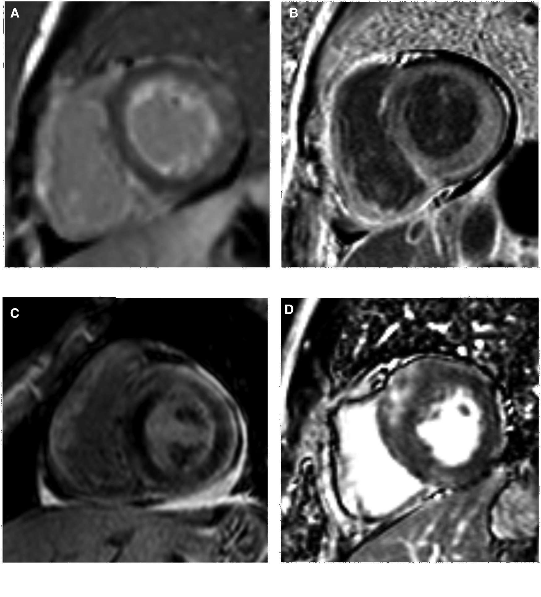 LV LGE images of AL-CA and HCM patients. (A,B) subendocardial and transmural LGE patterns of AL-CA patient, respectively; (C,D) focal patchy LGE pattern of AL-CA and HCM patient, respectively. LV, left ventricular; LGE, late gadolinium enhancement; AL-CA, light-chain patients with cardiac amyloidosis; HCM, hypertrophic cardiomyopathy.