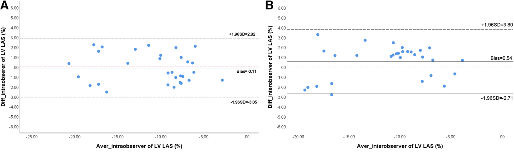 Bland-Altman analyses of intra-observer (A) and inter-observer (B) reproducibility for LV-LAS. LV, left ventricular; LAS, long-axis strain.