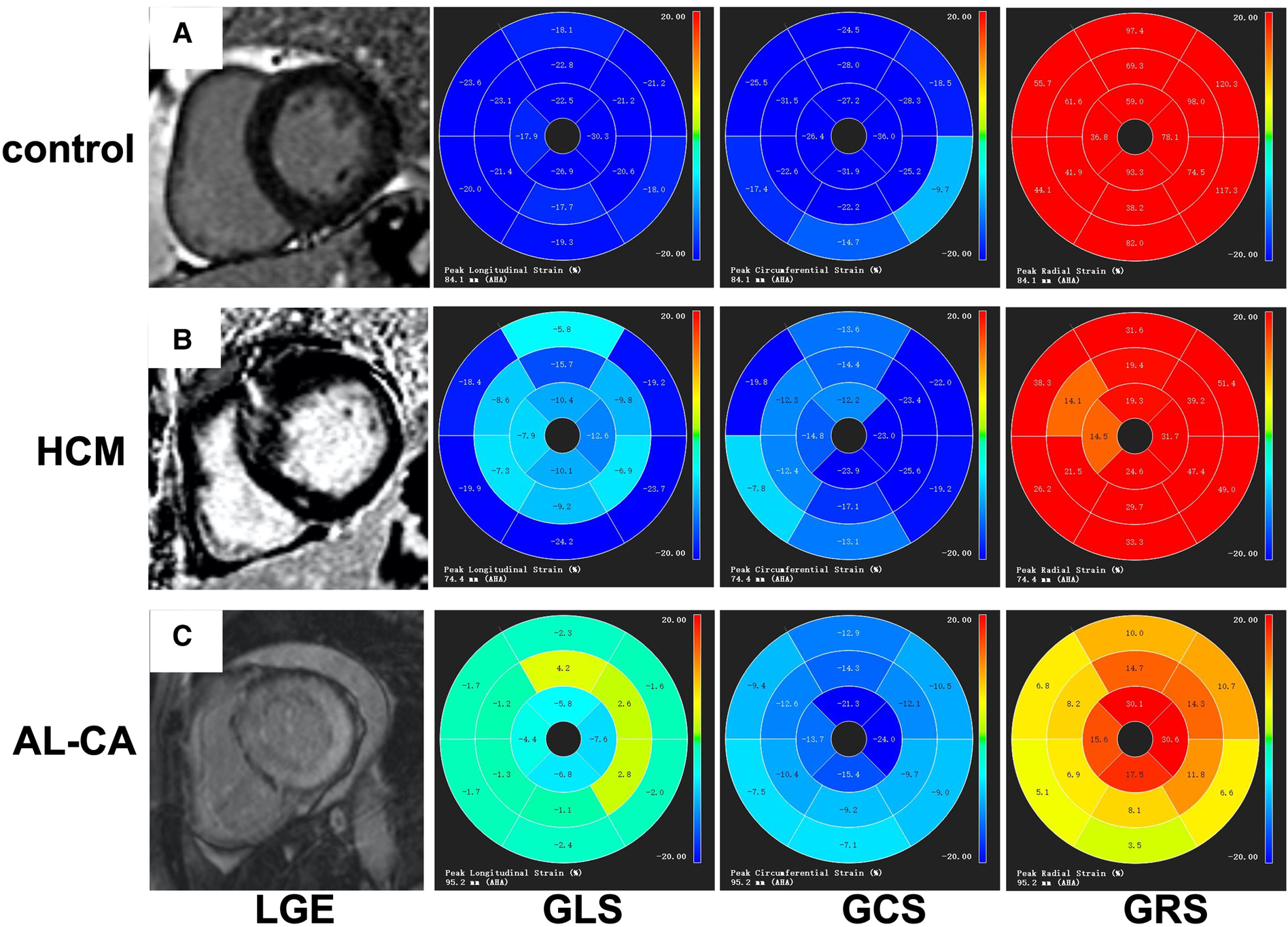 Examples of LV LGE images and bull's-eye charts of global strain. (A) A healthy control with negative LGE and normal value of strains. (B) A HCM patient with focal patchy LGE; segmental strain abnormalities were seen. (C) An AL-CA patient with transmural LGE and diffused abnormal global strains. LV, left ventricular; LGE, late gadolinium enhancement; GRS, global radial strain; GCS, global circumferential strain; GLS, global longitudinal strain; HCM, hypertrophic cardiomyopathy; AL-CA, light-chain patients with cardiac amyloidosis.