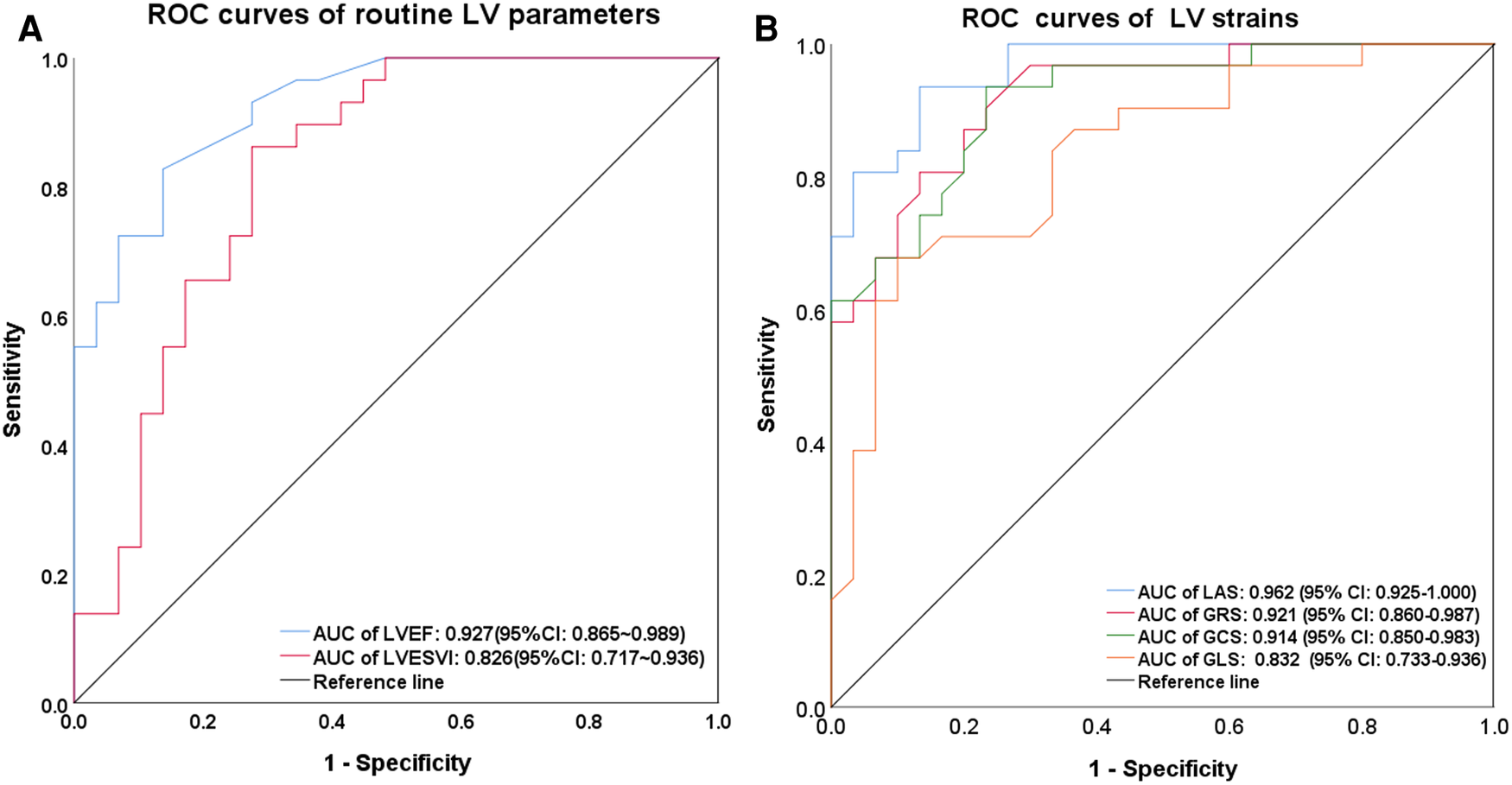 ROC curves in discriminating AL-CA from HCM. In ROC curve of routine left ventricular parameters (A), LVEF and LVESVI had a significant differential diagnostic efficacy, with the AUC of 0.927(P < 0.001) and 0.826 (P < 0.001), respectively. In ROC curve of left ventricular strain parameters (B), LAS demonstrated the highest AUC of 0.962 (P < 0.001) and 0.921 (P < 0.001) for GRS, 0.914 (P < 0.001) for GCS, and 0.832 (P < 0.001) for GLS, respectively. ROC, receiver operating characteristic; LV, left ventricular; LVESVI, left ventricular end-systolic volume index; AUC, area under the curve; LAS, long-axis strain; GRS, global radial strain; GCS, global circumferential strain; GLS, global longitudinal strain; HCM, hypertrophic cardiomyopathy; AL-CA, light-chain patients with cardiac amyloidosis.