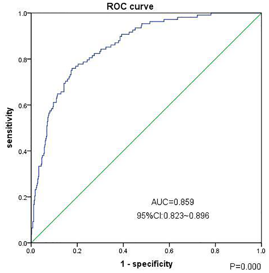 The efficacy of the clinical risk prediction model to predict the progression of CS-AKI to CKD: We selected the independent risk factors associated with the progression of CS-AKI to CKD in the multivariate regression analysis results (female sex, preoperative hypertension, coronary heart disease, congestive heart failure, preoperative low baseline eGFR, and higher serum creatinine level at discharge), including age, diabetes, hemoglobin level, mean arterial pressure, and other clinical factors to establish a comprehensive clinical risk prediction model. The regression model had good goodness of fit (Hosmer–Lemeshow test, chi-square level 5.693, P = 0.682); the area under the receiver operating characteristic curve for predicting progression from CS-AKI to CKD was 0.859 [95% confidence interval (CI): 0.823–0.896, P = 0.000], the sensitivity was 75.9%, the specificity was 82.2%, and the accuracy rate was 58.2% (shown in Figure 1).