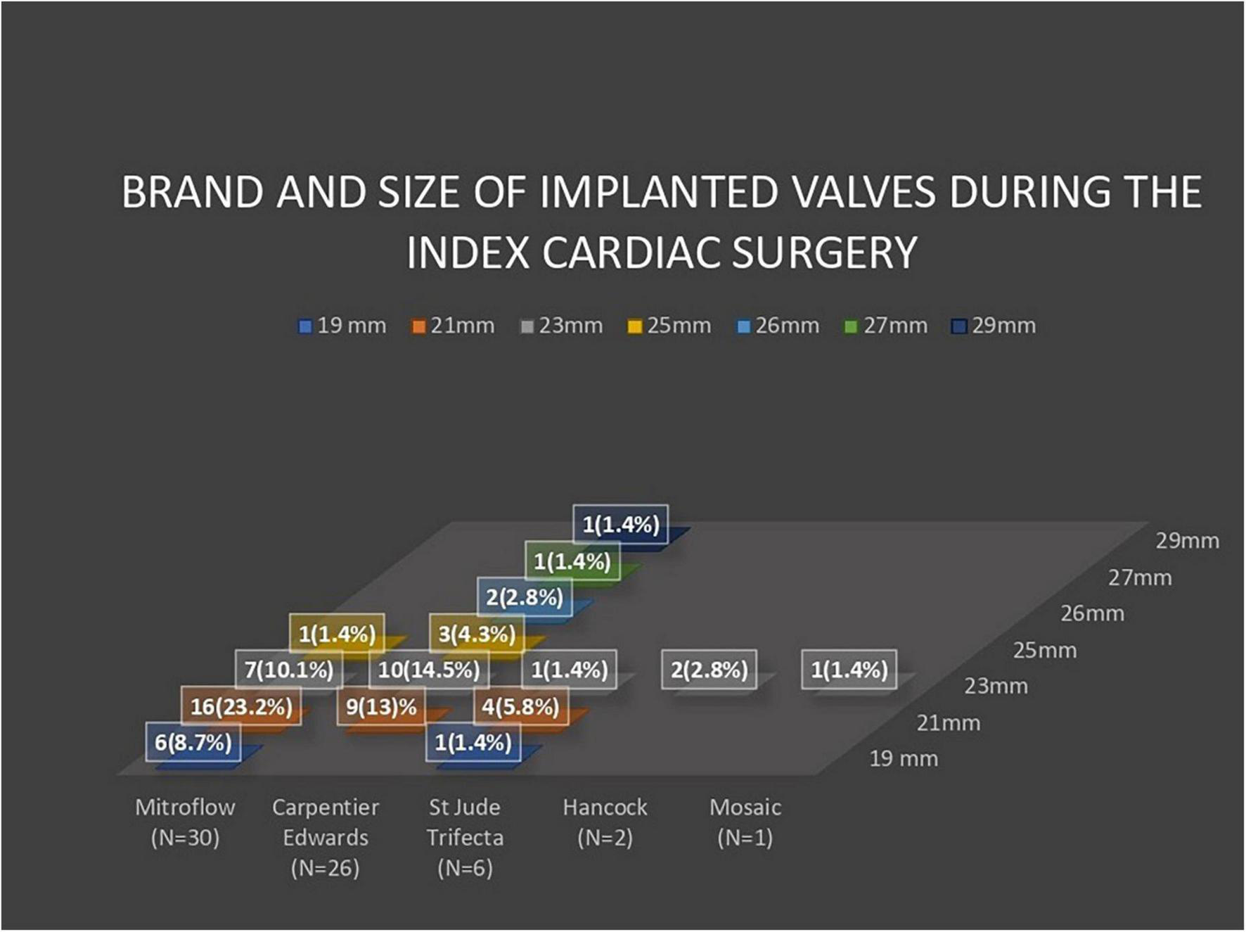 Histogram showing the brand and size of implanted valves during index cardiac surgery.