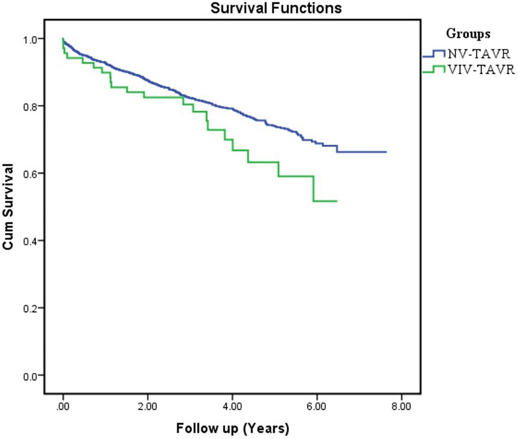 Kaplan-Meier survival outcome analysis in patients with VIV-TAVR versus NV-TAVR.