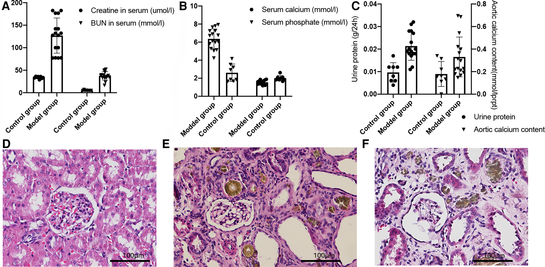 Biochemical indices of the animals analyzed by the Student's t-test. (A) Serum creatinine and blood urine nitrogen levels, P < 0.01. (B) Serum calcium and phosphate concentrations, P < 0.01. (C) 24-hour urine protein level (left, P < 0.01) and calcium content of the aortas (right), P < 0.01. (D–F) Kidney HE stains of the control group (D), non-VC group (E), and the VC group (F).