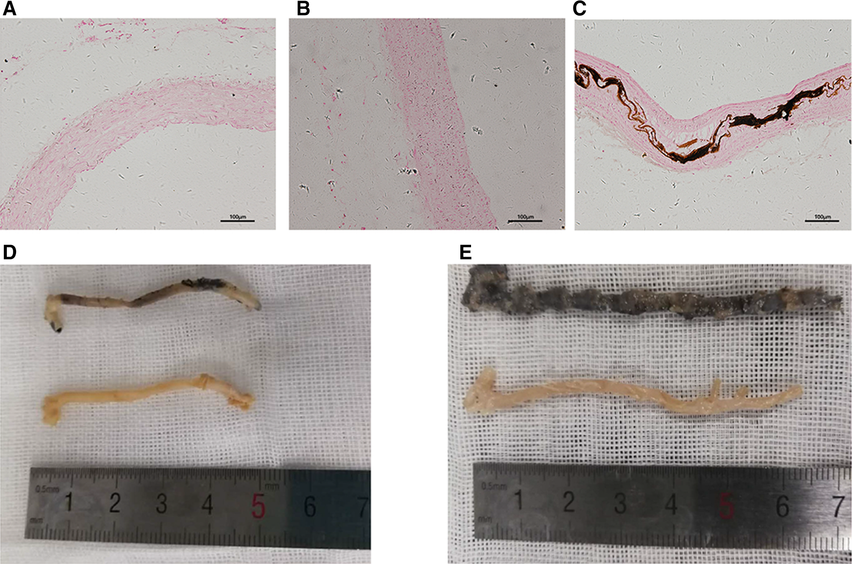 Calcification of the aorta. (A–C) Representative sliced aorta Von Kossa staining imaging of the control group (A), non-VC group (B) and VC group (C). (D,E) Representative aorta Von Kossa staining imaging of the control group (below) and the non-VC group (D, upper), and VC group (E, upper).