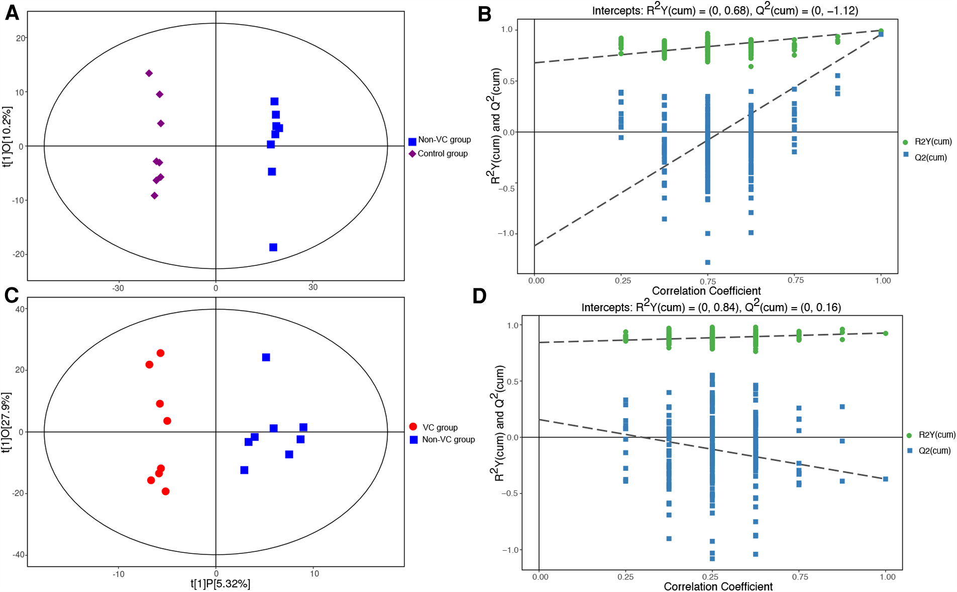 Scatter plots of the OPLS-DA scores. (A) Control group (purple diamonds) vs. the non-VC group (blue squares). (B) The permutation tests of the OPLS-DA models (control group vs. the non-VC group). (C) Non-VC group (blue squares) vs. the VC group (red dots). (D) The permutation tests of the OPLS-DA models (non-VC group vs. the VC group). The abscissa t [1] P-value represents the predicted principal component score of the first principal component, while the ordinate t [1] O represents the orthogonal principal component score. The scatter patterns in the different groups could be separated clearly and all were within the 95% confidence interval (Hotelling's T-squared ellipse). The retention of displacement of R2Y (green dots) was very close to 1. The Q2 (blue squares) of the original models was also very close to 1. The intercepts of the Q2 regression lines with the vertical axis were all <0, while the Q2 values were all lower than those of the original OPLS-DA models.