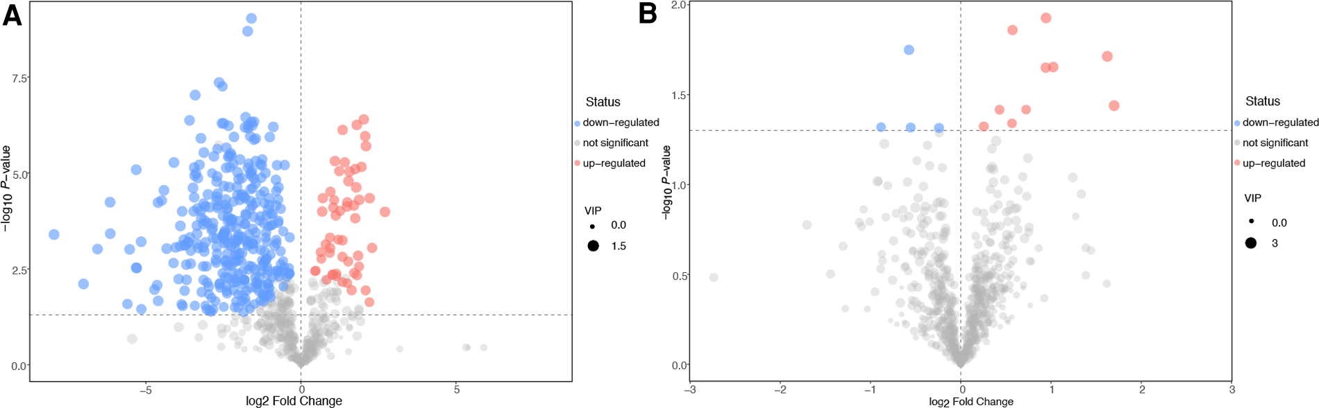 Volcano plots of the differential metabolites. Control group vs. the non-VC group (A). Non-VC group vs. the VC group (B). The abscissa represents a multiple change (base-2 logarithm) of the metabolite and the ordinate denotes the P-value (negative base-10 logarithm). The size of the dots indicates the VIP value in the OPLS-DA model. The upregulated metabolites are marked in red, downregulated metabolites in blue, and those with no significant difference shown as grey.
