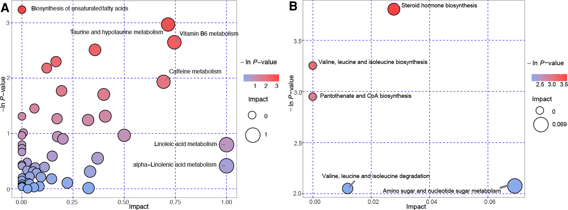 Bubble plots of the pathway analysis. Each bubble indicates a metabolic pathway. Control group vs. the non-VC group (A). Non-VC group vs. the VC group (B). The abscissa and size of the bubble represents the impact in the topological analysis of the pathway. The ordinate and color of the bubble represents the P-value (negative natural logarithm) in the enrichment analysis.