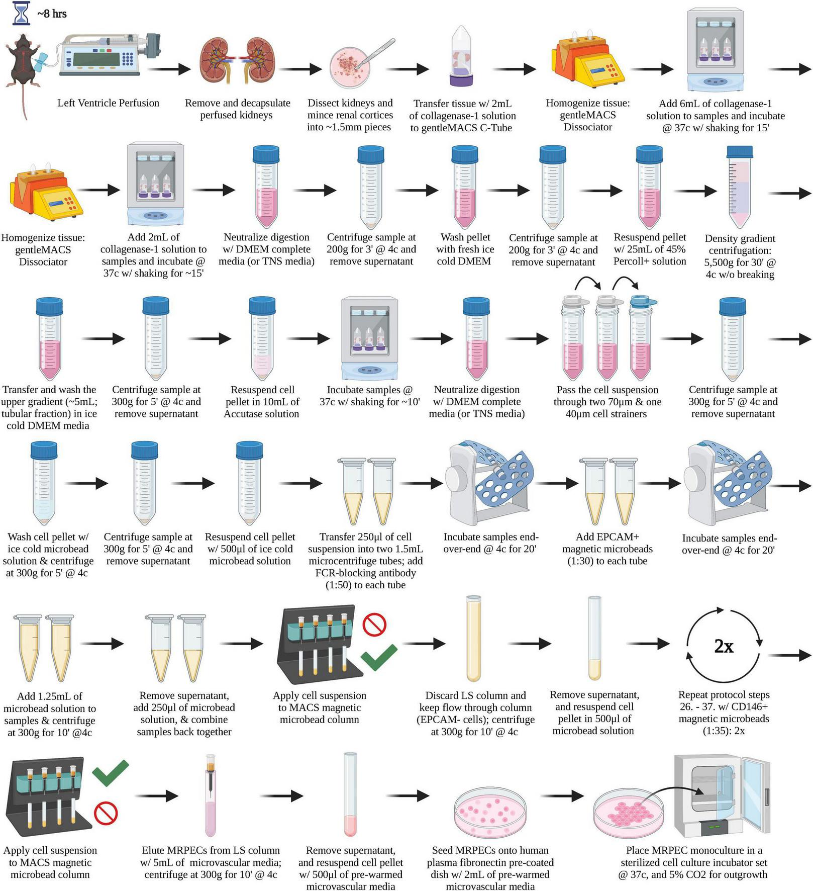 Renal MV-EC rarefaction has been previously observed in both human and animal studies of AKI (12). This MV-EC rarefaction exacerbates renal injury and increases the likelihood of AKI recurrence (∼20% of all AKI patients), as the renal microvasculature is essential for oxygen and nutrient delivery to extravascular tissue during proper renal repair processes (13). Various in vivo rodent studies have revealed that renal peritubular endothelial cells (RPEC) experience a high percentage (∼25–45%) of microvascular rarefaction and undergo endothelial-to-mesenchymal-transition post-AKI (∼10–15%) (14). Furthermore, AKI results in a persistent reduction in mitochondrial function, number, and cellular energetics (15). Conversely, pharmacological stimulation of mitochondrial biogenesis (MB) has been reported to enhance glomerular MV-EC function and promote functional renal recovery proceeding an AKI (16, 17). However, minimal AKI research has focused on the cellular pathways that govern proper RPEC repair mechanisms or how stimulation of MB contributes to these processes (18). This is in part due to the lack of commercially available RPECs, variability in the purity of primary isolated RPECs, and the difficulty of isolating/maintaining these cells in primary monoculture, as they are prone to undergo phenotypic loss (19). Thus, we developed a refined protocol for the isolation and monoculture of mouse renal peritubular endothelial cells (MRPEC) to address these issues and obtain MRPECs of suitable quality for downstream in vitro physiologically and pharmacological microvasculature experiments.