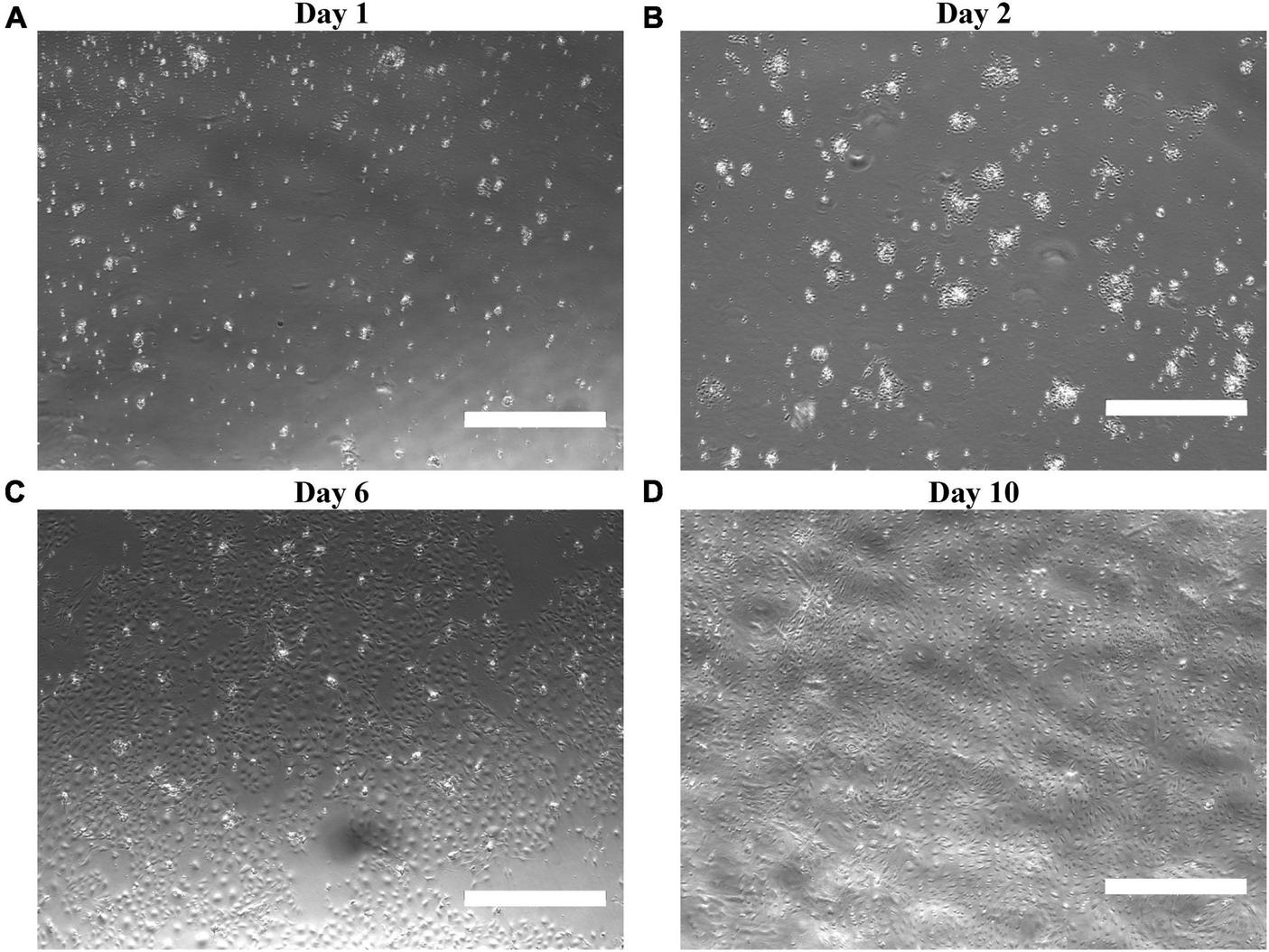 Characterization of isolated MRPECs outgrowth and morphology in monoculture. Representative phase-contrasted photomicrographs of MRPEC monoculture, outgrowth, and morphology at various post-isolation time points. MRPECs monoculture, outgrowth, and morphology at (A) 1 day post-isolation, (B) 2 days post-isolation, (C) 6 days post-isolation, and (D) 10 days post-isolation. N = 3–5/time point. Scale bars, 750 μm.