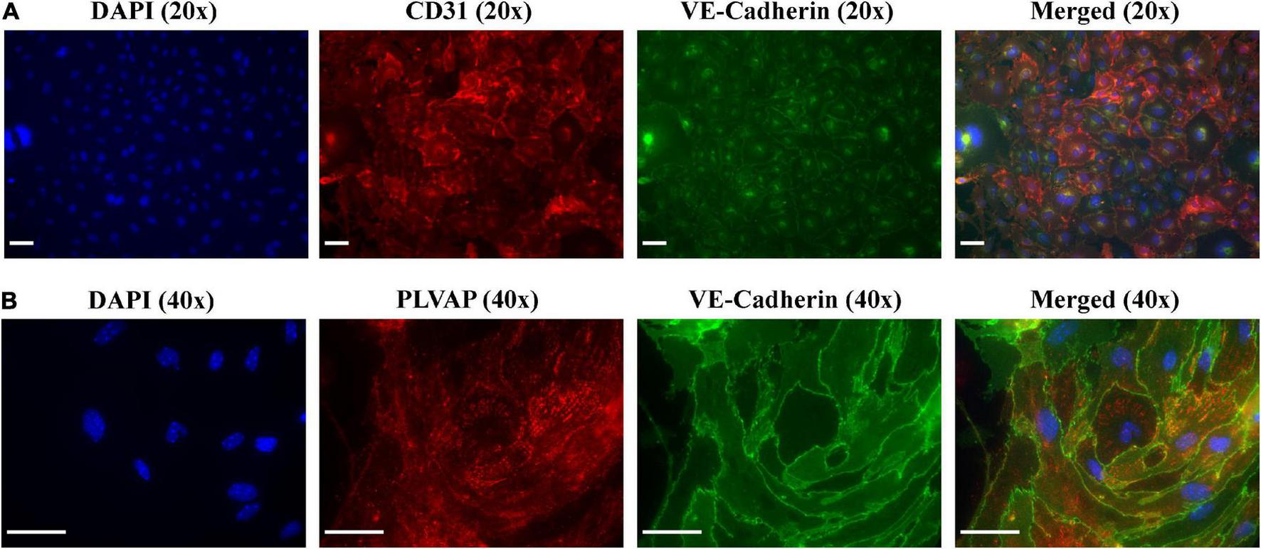 Immunofluorescent imaging (IF) and characterization of MRPECs 10 days post-isolation. Representative IF-photomicrographs of MRPEC monocultures 10 days post-isolation. (A) Nuclear staining DAPI (panel 1, blue), PECAM1+ staining (panel 2, red), VE-cadherin+ staining (panel 3, green), and merged (panel 4); all representative images in panel (A) were taken at 20× magnification. (B) Nuclear staining DAPI (panel 1, blue), PLVAP+ staining (panel 2, red), VE-cadherin+ staining (panel 3, green), and merged (panel 4); all representative images in panel (B) were taken at 40× magnification. All representative images were obtained on an EVOS-M5000 fluorescence microscope system and merged by overlay in FIJI (ImageJ) software. N = 4–6 isolations. Scale bars, 50 μm.