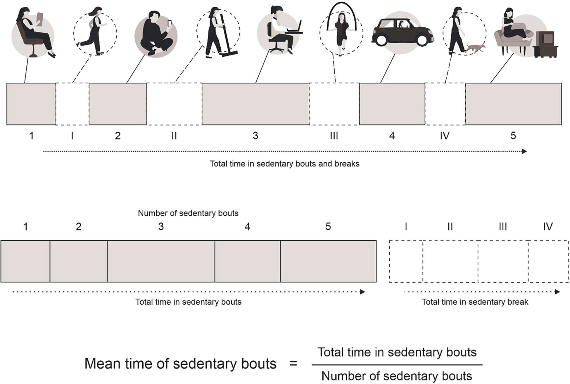 - The total time in sedentary breaks: The sum of the time spent in physical activities (≥200 cpm for at least 10 min).