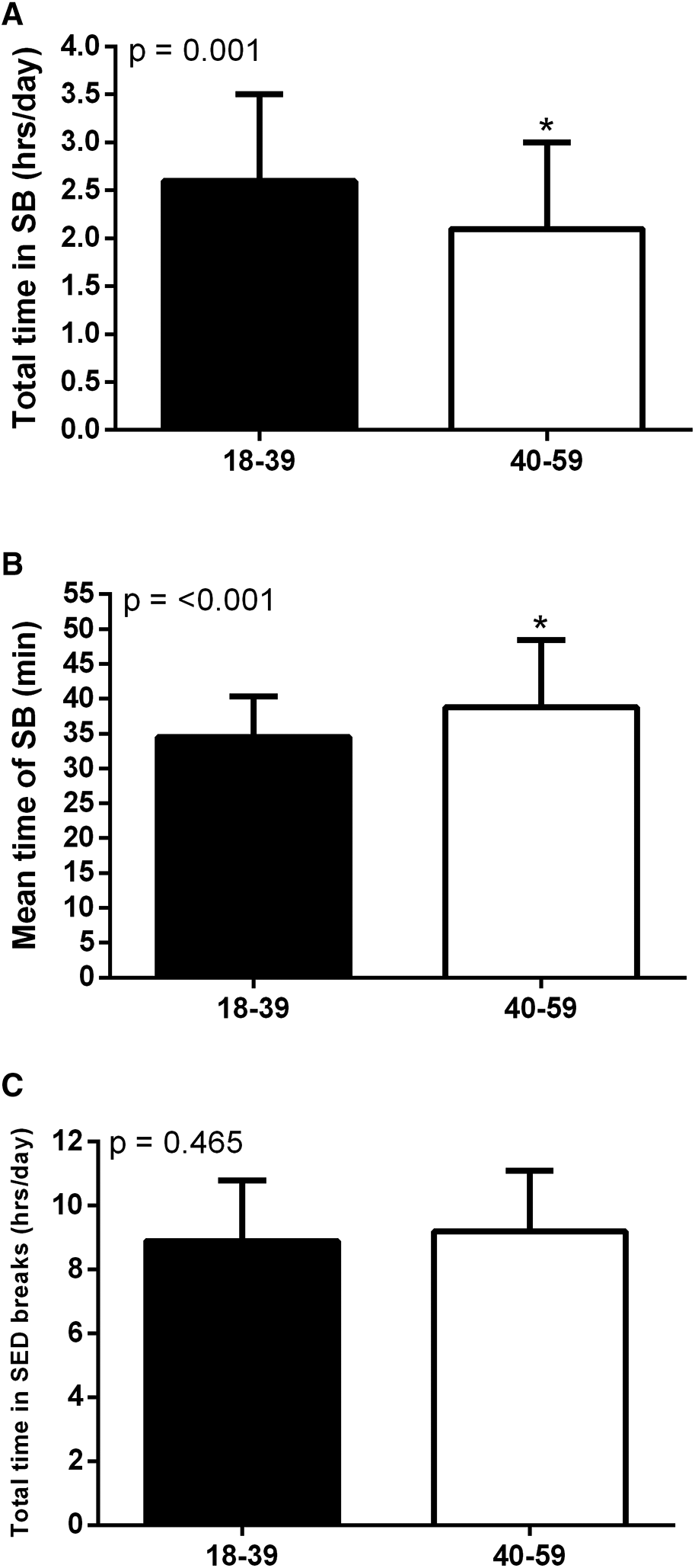 Total time in sedentary bouts (A), mean time of sedentary bouts (B) and total time in sedentary breaks (C) by age group. *Significant difference between age groups.