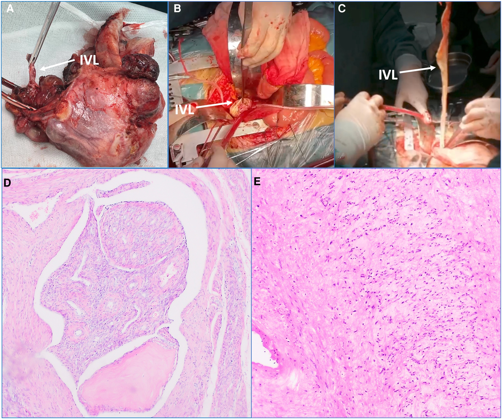 Main intraoperative steps and postoperative pathological examination results. (A) The uterus and the surrounding tissues were excised, and the arrow heads to the intravenous leiomyomatosis (IVL). (B,C) The tubula-like IVL was found in inferior vena cava (IVC). The arrow heads to IVL. (D) The excised tissues in uterus were sent to the pathological examination. The tumor cells are generated in the lobed shape in the vascular lumen. Immunohistochemical results: CD34 (+), Desmin (+), SMA (+), calponin (+), CD31 (+). This result was consistent with the preoperative diagnosis. (E) The excised tissues in IVL were sent to the pathological examination. Immunohistochemical results: CD34 (+), Desmin (+), SMA (+), calponin (+), CD31 (+). This result was consistent with the preoperative diagnosis.