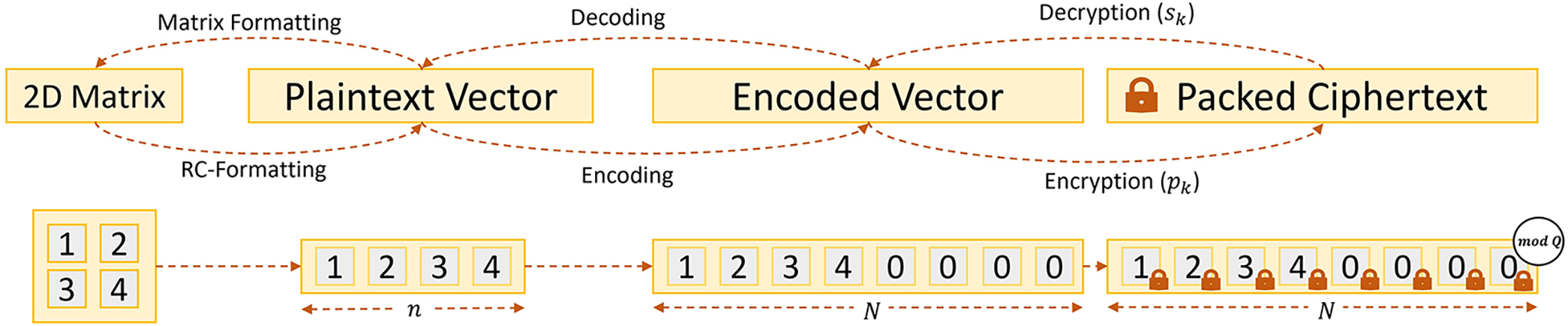 The encryption routine takes a public key and an encoded vector to generate a ciphertext vector such that . The inverse decryption routine takes a ciphertext and uses the private key to obtain the encoded vector such that .