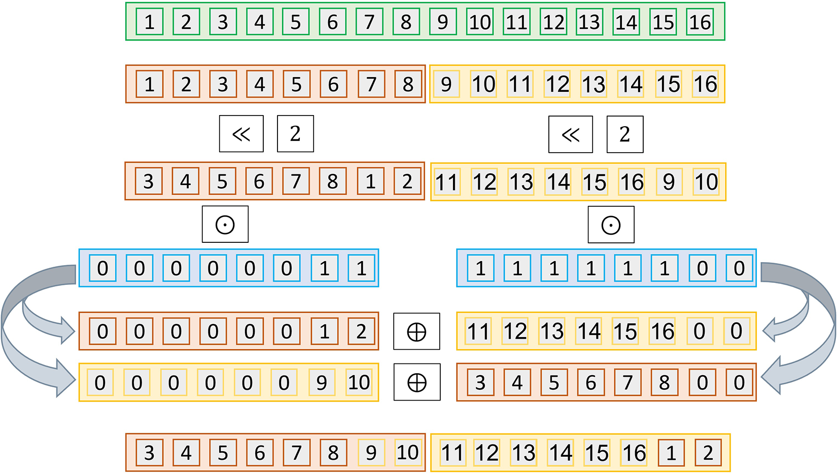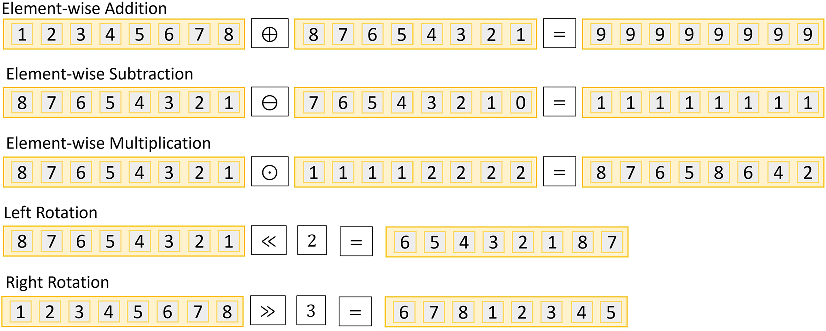 The different evaluation routines compute over the ciphertext one of the following operations: Element-wise Sum () Element-wise Subtraction (), Element-wise Multiplication (), and left/right Rotation ( and respectively). We depict the SIMD schemes operation behavior in Figure 2.