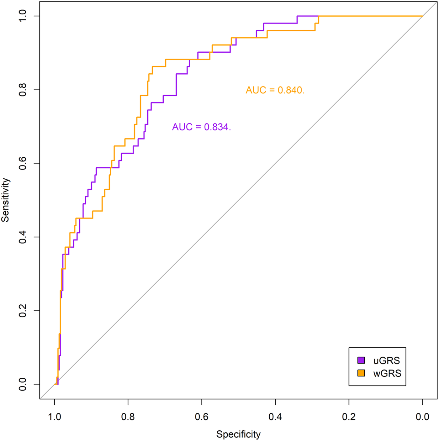 Receiver operating characteristics (ROC) curves of the two genetic risk scores, unweighted (uGRS) and weighted (wGRS), adjusted by principal components analyses, sex and age. Areas under the curves (AUC) are indicated. The straight line represents the ROC expected by chance only.