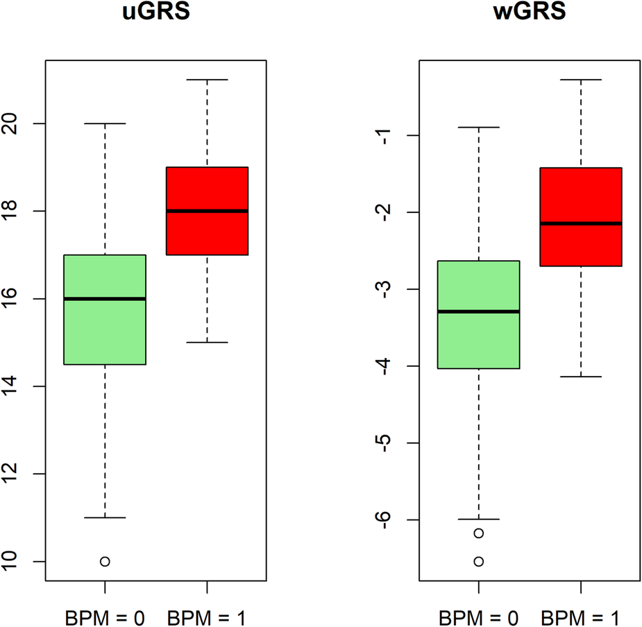 Boxplot of the distribution of unweighted genetic risk score (uGRS) and weighted genetic risk score (wGRS). Values for the groups: normal blood pressure (BPM = 0) and risk of hypertension (BPM = 1).