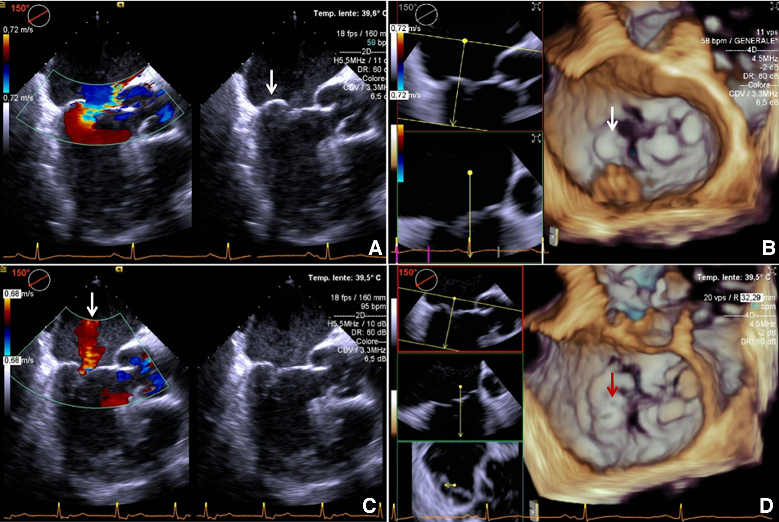 Intraoperative transesophageal echocardiography. (A,B): before retensioning procedure 2D + color Doppler and 3D; eccentric regurgitation jet directed to AML and reprolapsing PML (arrow). (C,D): after retensioning procedure 2D + color Doppler and 3D: (C) central postprocedural mild MR (arrow) is showed. (D) Mild residual PML prolapse is highlighted (arrow) and a good coaptation between AML and PML is reached. AML, anterior mitral leaflet; MR, mitral regurgitation; PML, posterior mitral leaflet.