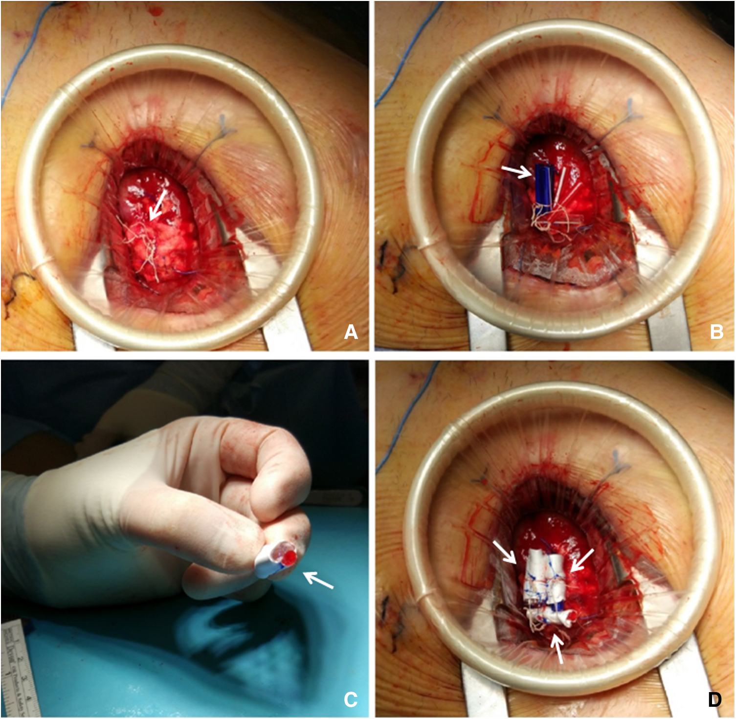 (A) Apex re-exposure through previous left mini-thoracotomy reopening: Identification of the chordal loops sprouting from the Teflon pledget (arrow) corresponding to the ventricular access site. (B) Samples sizing: temporary samples made of tourniquet tubing pieces (arrow) are positioned inside the loops, between the knots and the Teflon pledget. (C) Defining final samples: once the desired shape is set, the tourniquet pieces are fixed together with a 4-0 prolene suture and then covered with a Gore-Tex vascular prosthesis (arrow). (D) Samples fixation: definitely samples (arrows) are inserted inside the chordal loop and then fixed by suturing the vascular prosthesis to the corresponding loop with a 4-0 prolene suture.