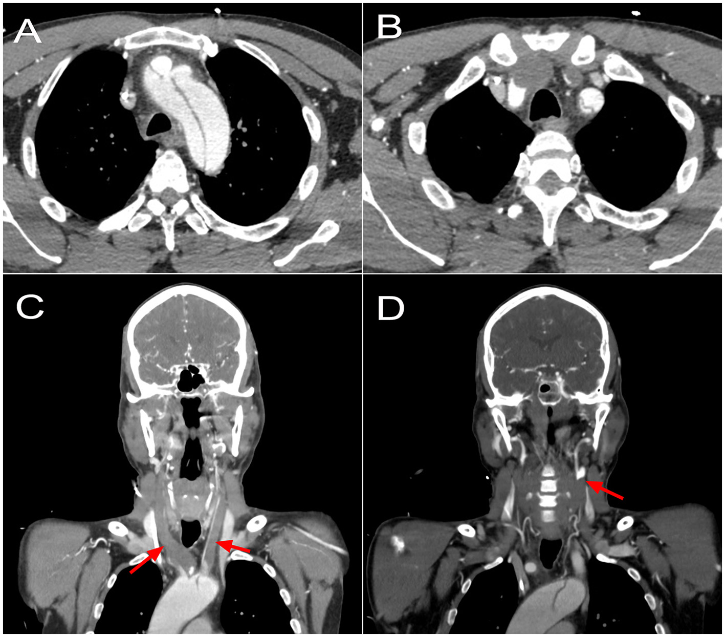 Preoperative CT scan showing (A) an acute type A dissection compromising the aortic arch and origin of supra-artic vessels. (B) A complete occlusion of the brachiocephalic trunk, with reperfusion of the right subclavian artery; a complete occlusion of the left common carotid artery; a dissected left subclavian artery. (C) A coronal reconstruction showing complete occlusion of both common carotid arteries since origin at the aortic arch (arrows). (D) A coronal reconstruction showing reperfusion at the level of the left carotid bifurcation (arrow).