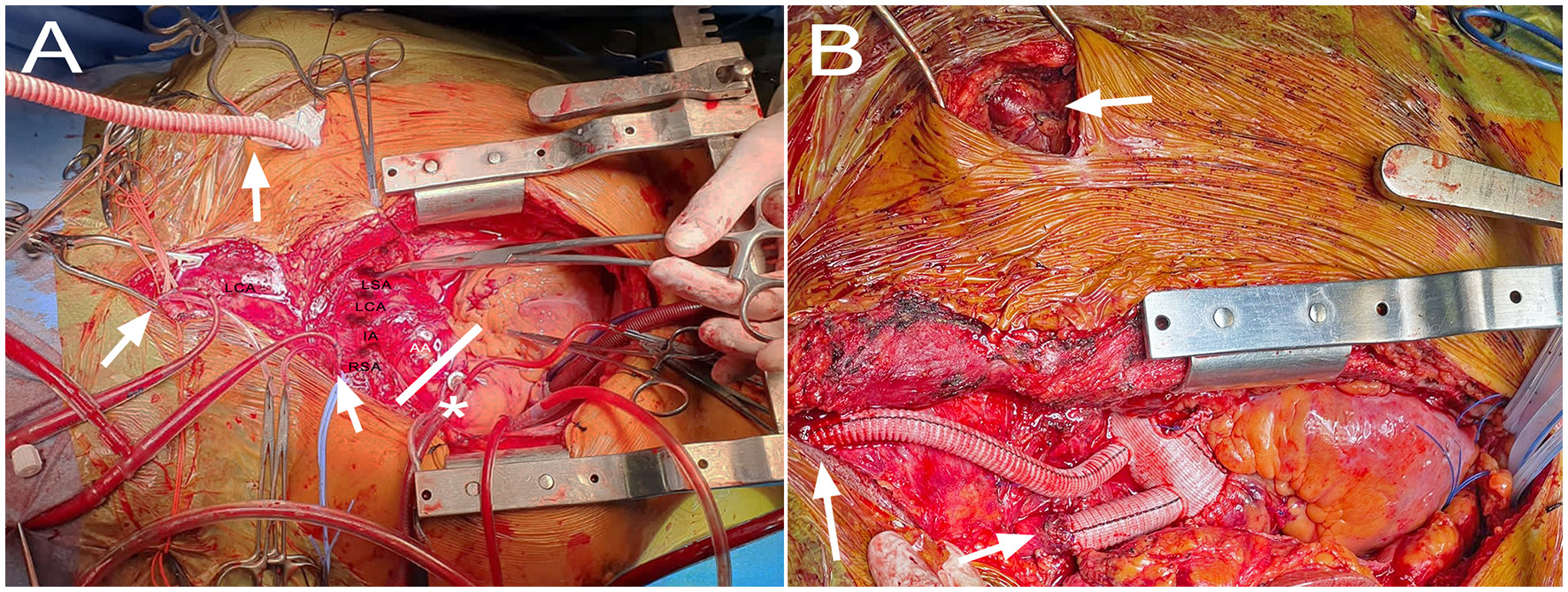 Intraoperative images showing (A) perfusion setup with direct ascending aorta (AA) cannulation in the uncompromised segment (*), pediatric cannulas to the right subclavian (RSA) and left internal carotid arteries, and Dacron graft to the left subclavian artery (arrows). The white lines depict the cross-clamp site to allow for cardiac perfusion through the aortic cannula. The innominate artery (IA), left carotid artery (LCA) and left subclavian artery (LSA) are also appreciated. (B) The final result with the Thoraflex deployed, and its branches anastomosed to the right subclavian artery, left carotid bifurcation, and left subclavian artery (arrows).