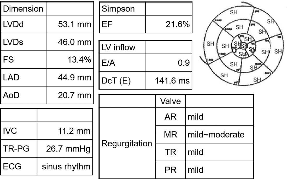 Transthoracic echocardiogram findings at the emergency department visit. LVDd, left ventricular internal dimension in diastole; LVDs, left ventricular internal dimensions in systole; FS, fractional shortening; LAD, left atrial dimension; AoD, aortic root diameter; IVC, inferior vena cava; TR-PG, tricuspid regurgitation peak gradient; ECG, electrocardiogram; EF, ejection fraction; LV, left ventricle; E/A, early-to-late transmitral velocity; DcT, deceleration time; AR, aortic regurgitation; MR, mitral regurgitation; TR, tricuspid regurgitation; PR, pulmonary regurgitation; SH, severe hypokinesis.