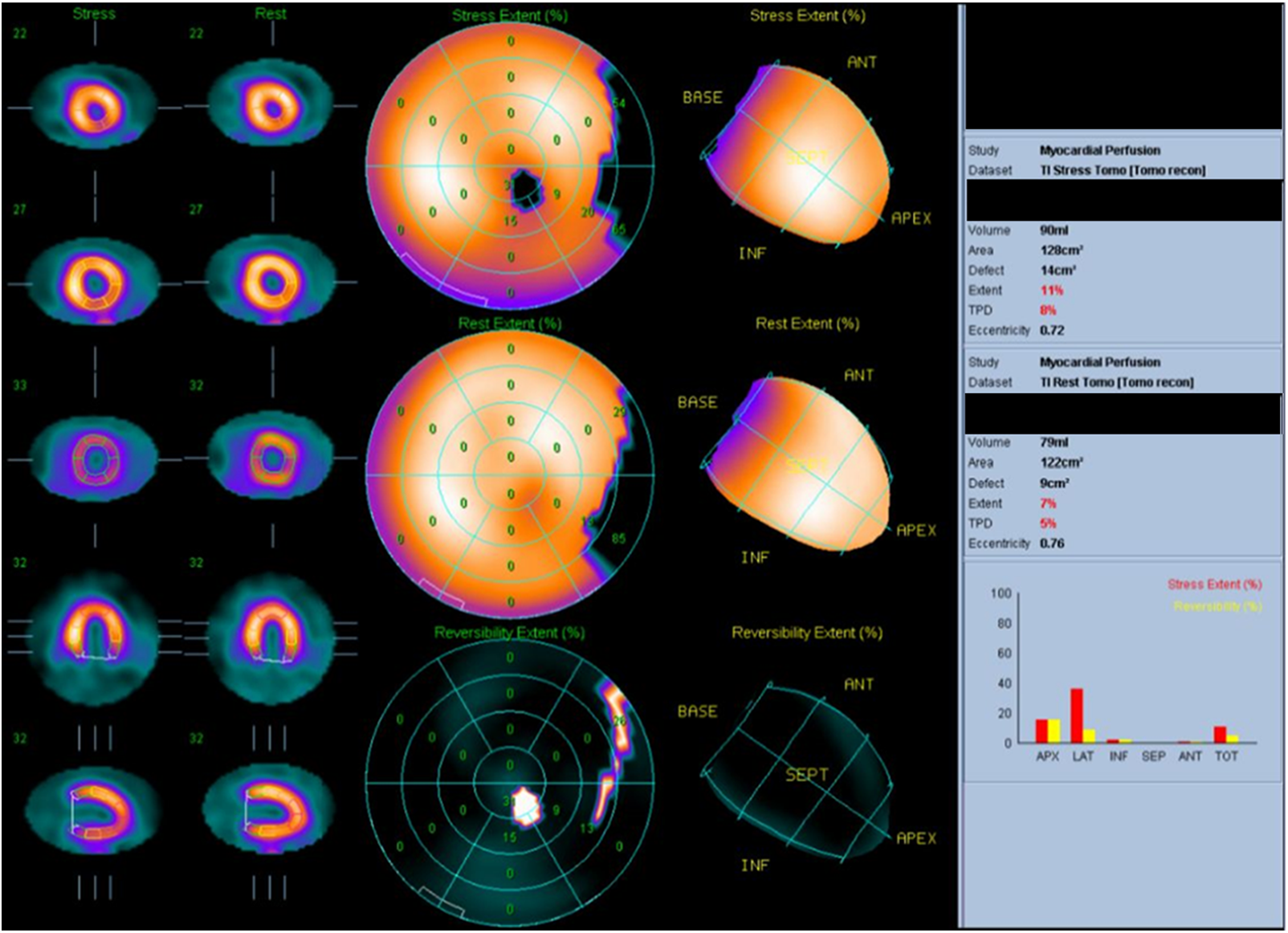 Thallium-201 myocardial perfusion: transient ischemic dilatation and old myocardial infarction of the left circumflex artery.