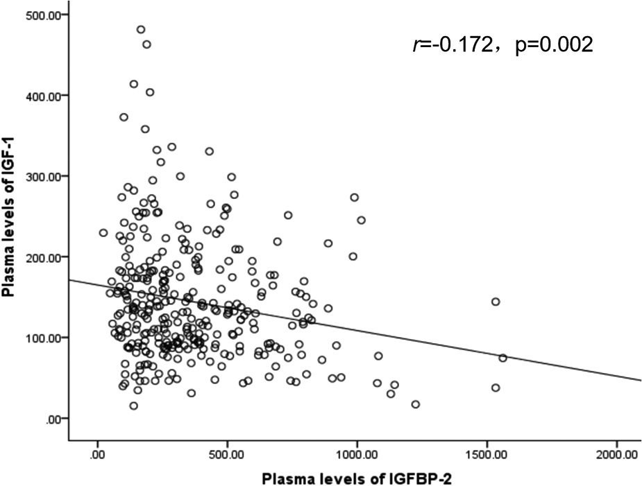The Shapiro–Wilk test was used to determine whether continuous data were normally distributed. Normally distributed continuous variables were expressed as mean ± standard deviation; data not normally distributed were expressed as median (interquartile range). Comparisons of continuous variables between two groups were performed using the Mann–Whitney U test or t-test. Comparisons of continuous variables among four groups were performed using one-way analysis of variance or the Kruskal–Wallis H test. The pairwise test for multiple comparisons was used to analyze intergroup differences for IGF-1 and IGFBP-2 levels after Kruskal–Wallis H analysis. Categorical variables were presented as frequency and percentage and compared using the chi-squared test. Spearman correlation analysis was performed to analyze the correlation of plasma IGF-1 and IGFBP-2 levels.