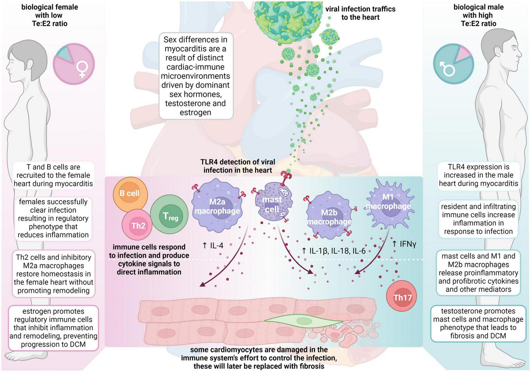First, sex and gender are not interchangeable terms. Sex refers to biological differences attributed to chromosomes, hormones, reproductive anatomy, gene expression, etc., and typically refers to a binary of male or female but can include intersex (5, 8, 9). Gender, on the other hand, is a social construct that is rooted in biology but affected by environment and experience. Gender is not a binary, but a broad spectrum where individuals may identify as cis or transgender, non-binary, gender-neutral, or in other ways as they define their own gender (8, 10, 11). Biological sex does not change over time, but gender varies in different cultures and with time. This review summarizes data from studies over the past decade which focused on cis-gendered populations, but few if any studies have examined the role of gender on myocarditis or DCM. Although we do not specifically report data on gender differences in this review of myocarditis and DCM because the research has not yet been conducted (i.e., studies designed to understand the effect of gender on disease outcomes), it is important in a discussion of sex differences to understand that there are also environmental and social interactions (gender differences) that affect sex differences outcomes both for animal studies and human data.