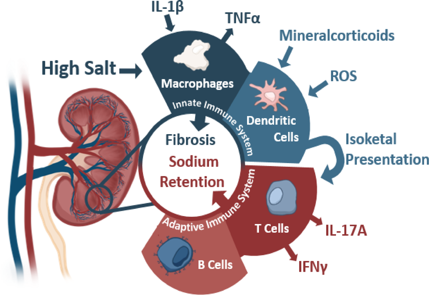 The contributions of the innate and adaptive immunity to kidney damage during hypertension with various activating stimuli and subsequent cytokine production. Sources below: Macrophages: IL-1β (Veiras et al., 2022, Circulation Research, secondary hypertension), TNFα (Singh et al., 2013 American Journal of Physiology: Renal Physiology, essential hypertension). Dendritic Cells: Mineralcorticoids (Araos et al., 2019 Journal of Hypertension, secondary hypertension), ROS (Lu et al., 2020 Hypertension, essential hypertension), and Isoketals (Kirabo et al., 2014, Journal of Hypertension, essential hypertension). T Cells: IL-17 (Kamat et al., 2015, Hypertension, essential hypertension), IFNγ (Benson et al., 2022 Circulation Research and Kamat et al., 2015, Hypertension, essential hypertension). B Cells: (Chan et al., 2015 Hypertension.)