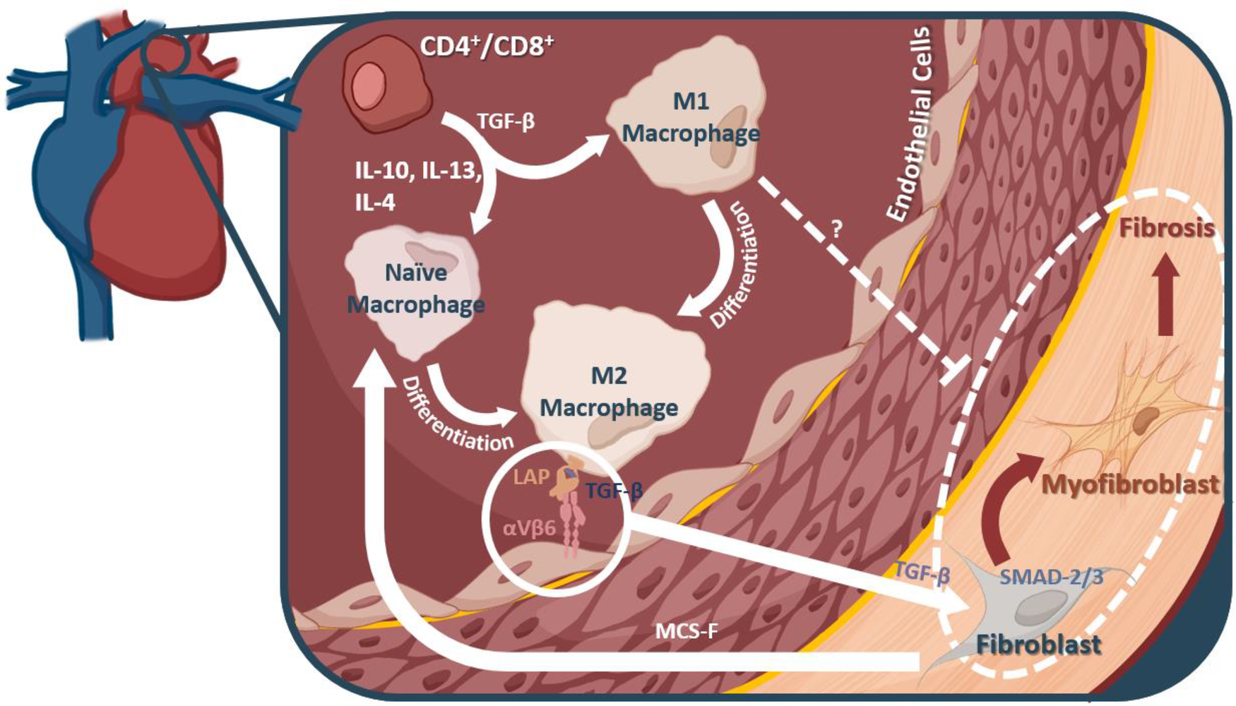Macrophages and their mechanistic role in fibrosis. M2 macrophages can interact with αVβ6, thereby releasing a TGF-β inhibitor protein, and allowing them to interact with fibroblasts in the heart. TGF-β leads to myofibroblast differentiation from fibroblasts via the SMAD2/3 pathway. It is these myofibroblasts that are thought to account for much of the fibrotic remodeling in many diseases, including diastolic dysfunction and heart failure.
