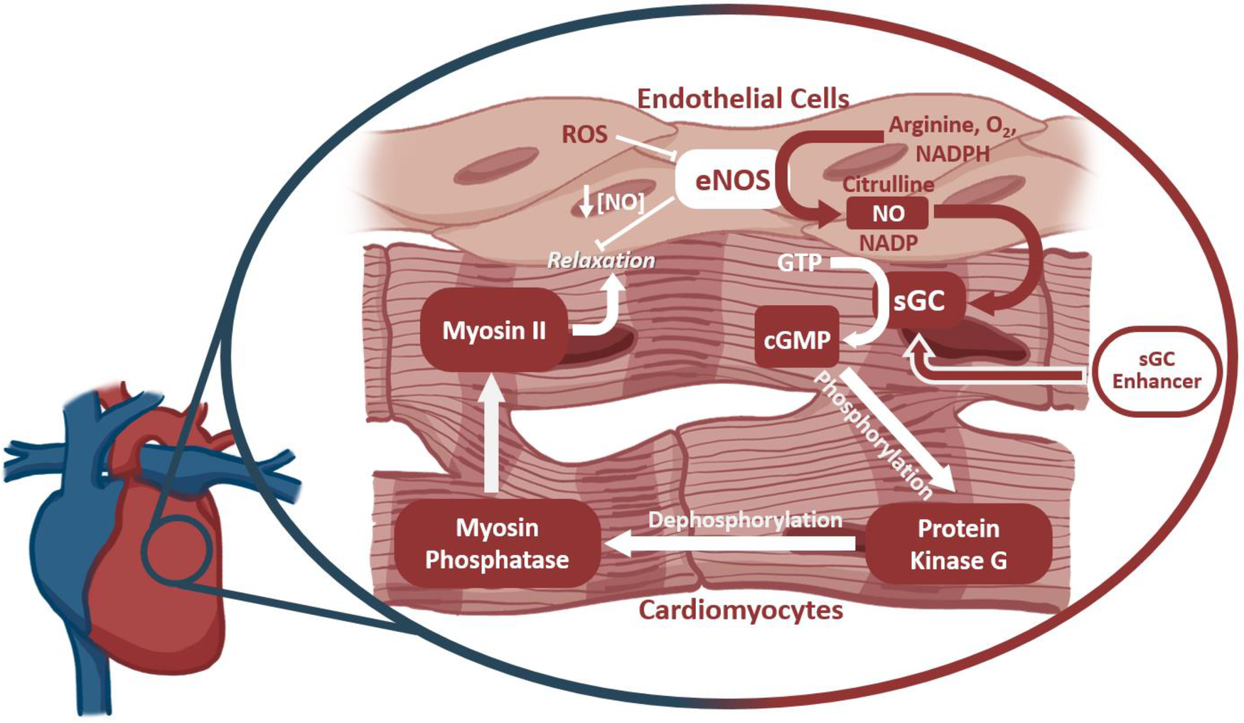 The outcome of ROS production on cardiomyocyte function. Soluble Guanylate Cyclase (sGC) drives Myosin II dephosphorylation and smooth muscle relaxation via production of the secondary messenger cGMP. sGC is activated by intercellular NO produced by endothelial nitric oxide synthase (eNOS). Reactive oxygen species inhibit eNOS activity, thereby affecting cardiomyocyte function further downstream. sGC enhancers target sGC at an allosteric site to increase its sensitivity to NO, thereby rescuing function despite lower NO availability.