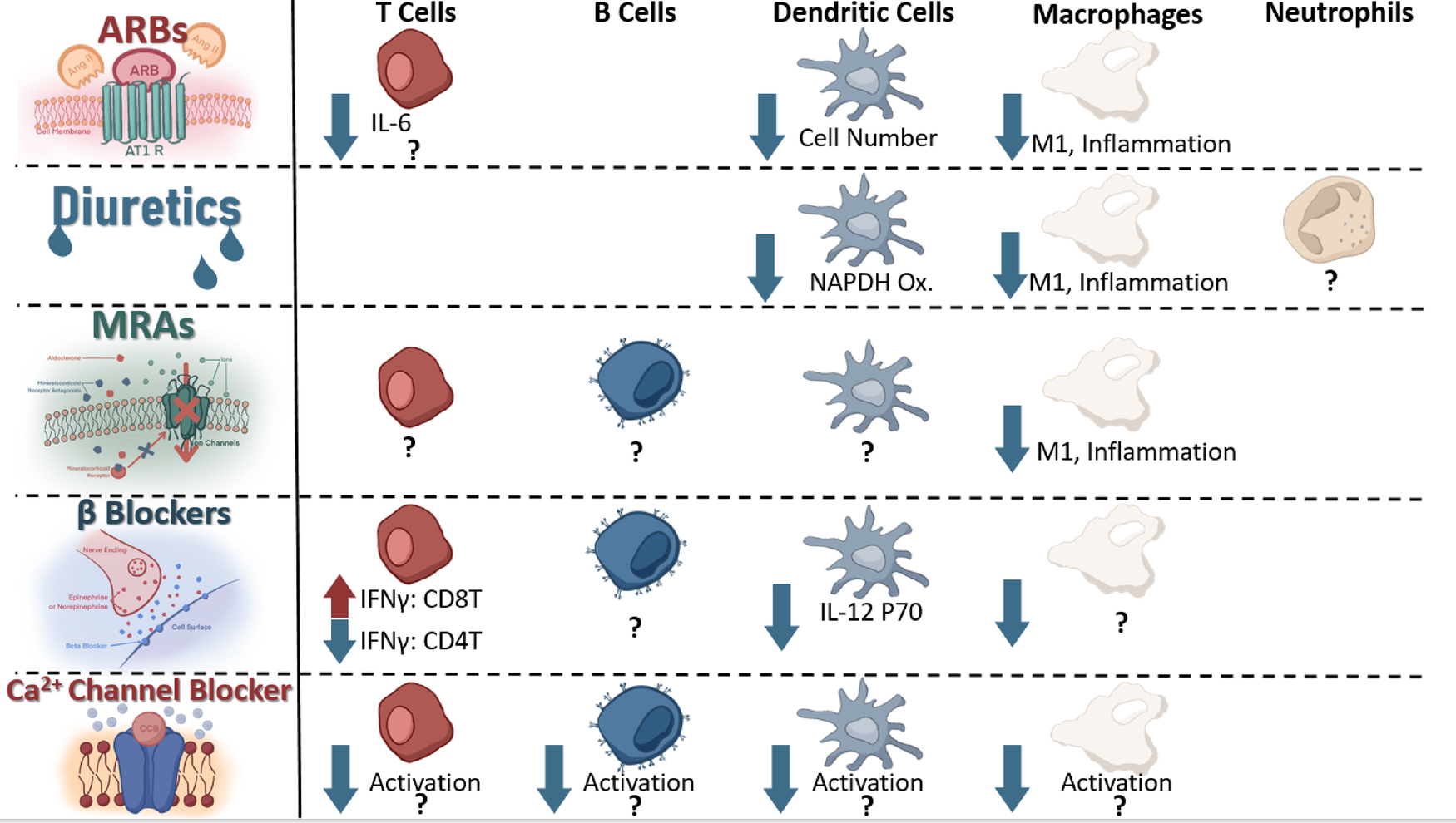 Immune cells known to express receptors antagonized by current antihypertensives and known change in signaling or function as a result of receptor antagonism.