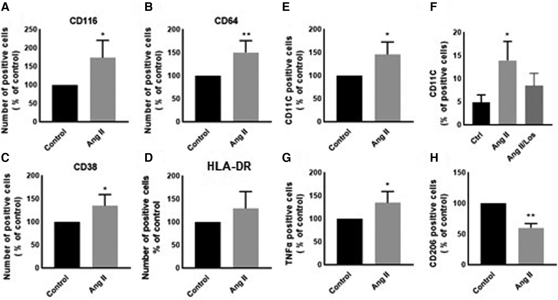Ang II change THP-1-like macrophage phenotype. The number of positive cells in frequency (%) of (A) CD116, (B) CD64, (C) CD38, (D) HLA-DR, (E,F) CD11c, (G) TNF-α, and (H) CD206 were analyzed by flow cytometry using THP-1-derived macrophage treated with angiotensin II (Ang II) (1 µM) for 24 h or untreated cells (Control). In a separate experiment, and before the Ang II treatment, the cells were incubated with Losartan (100 µM) for 2 h (Ang II/Los) (F). The results are presented as means ± SEM, n = 3–4. *P < 0.05 and **P < 0.01 and compared with controls.