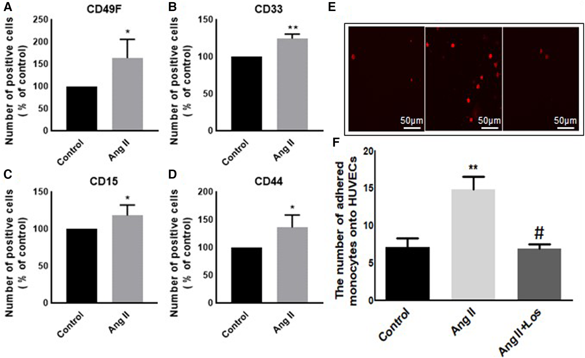 Ang II increases monocyte adhesion to HUVEC cells. The number of positive cells in frequency (%) of (A) CD49F, (B) CD33, (C) CD15, and (D) CD44 were analyzed by flow cytometry using THP-1-derived macrophage cells treated with Ang II (1 µM) for 24 h; Losartan (100 µM) and Ang II (Ang II/Los) or untreated cells (Control). (E,F) The number of adherent monocytes onto HUVECs, determined using EVOS microscope. The results are presented as means ± SEM, n = 4. *P < 0.05 and **P < 0.01 and compared with controls.