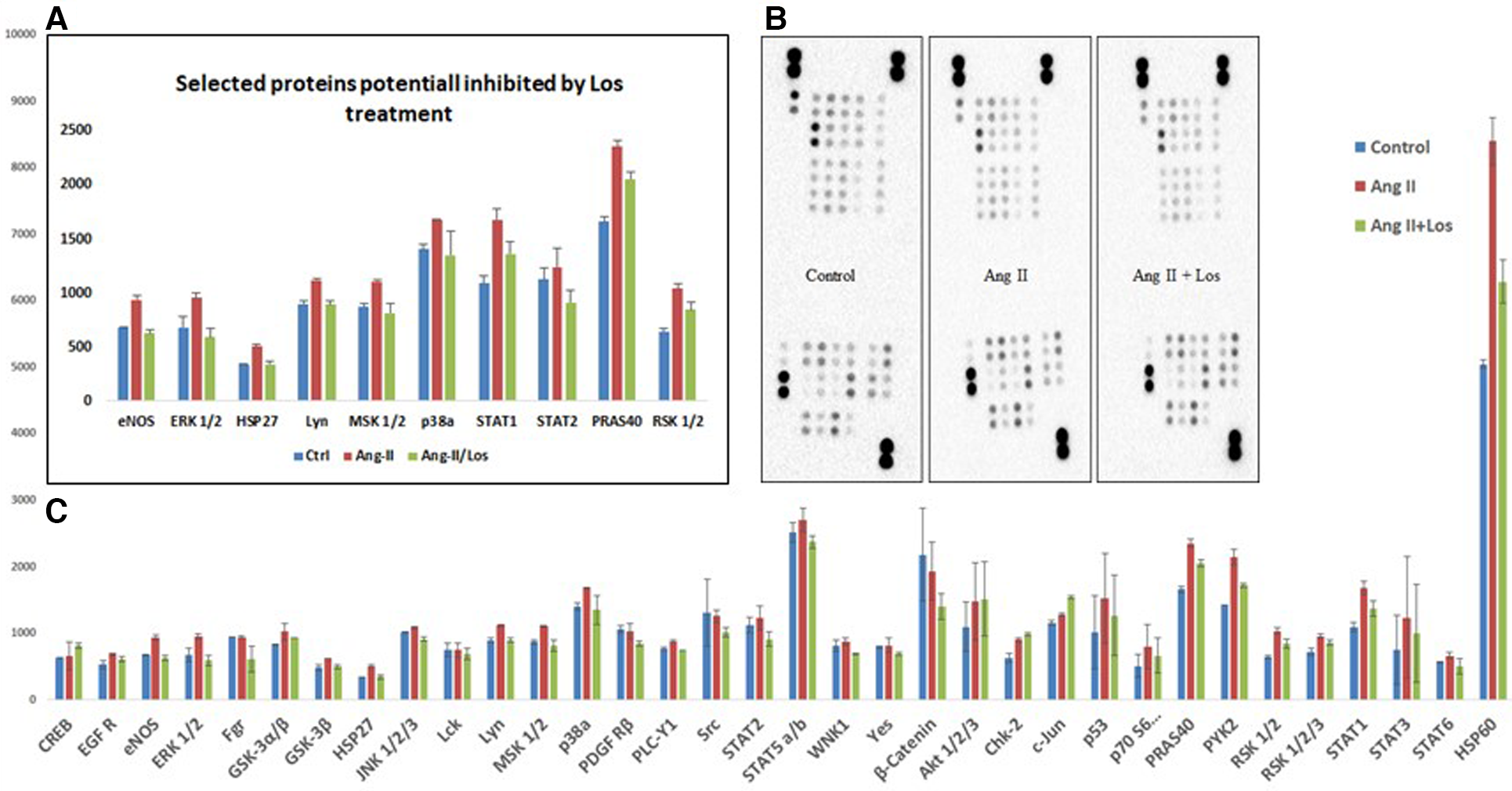 Ang II increases the phosphorylation level of kinases in THP-1 macrophages. Analysis of a proteome profiler for phospho-kinases using THP-1-derived macrophage cells treated with Ang II (1 µM) for 24 h; Losartan (100 µM) for 2 h before the Ang II treatment (Ang II/Los) or untreated cells (Control). Phosphorylated signaling proteins presented as densitometric analysis. (A) Selected proteins inhibited by Losartan. (B) Data of each array (Part A and B) incubated with 100 μg of cell lysate, shown from a 5-min exposure. (C) Proteins panel differentially expressed following the Ang II treatment without significant effect of Losartan. The results are presented as means ± SEM, *P < 0.05, and **P < 0.01 and compared with controls.
