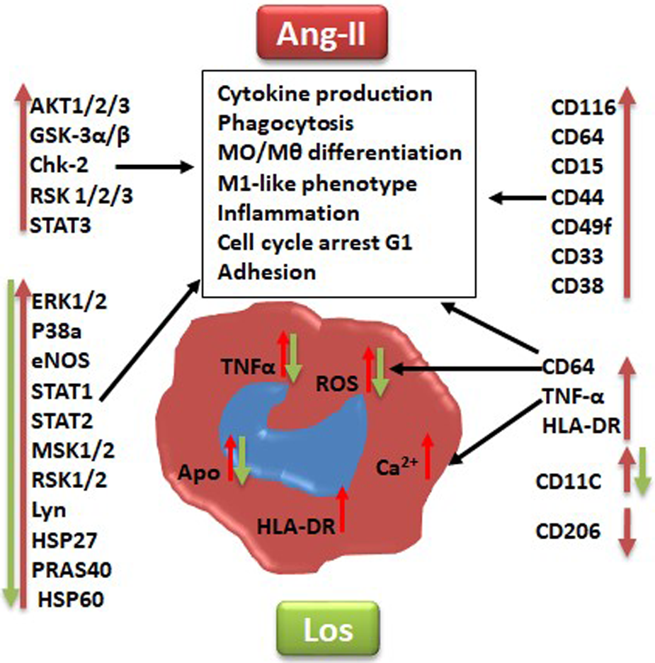 Graphical summary suggested pathways that might be implicated at least in part in angiotensin II inducing monocyte/macrophage dysfunction and polarization (red arrow) and angiotensin type 1 receptor involvement in this process (green arrow). Los, Losartan; ROS, reactive oxygen species; Ca2+, intracellular calcium. CD markers for cell phenotype and macrophage polarization: CD116, CD64, CD38, HLA-DR, CD15, CD33, CD49F, CD44, CD11c, TNF-α, and CD206. Human kinases: Akt 1/2/3, GSK-3 alpha/beta, Chk-2 (T68), RSK1/2/3 (S380), ERK1/2 (T202/Y204, T185/Y187), STAT3, p38 alpha, eNOS, STAT1, STAT2, MSK1/2, RSK1/2/3, HSP27 (S78/S82), Lyn (Y397), PRAS40 (T246), and HSP60.