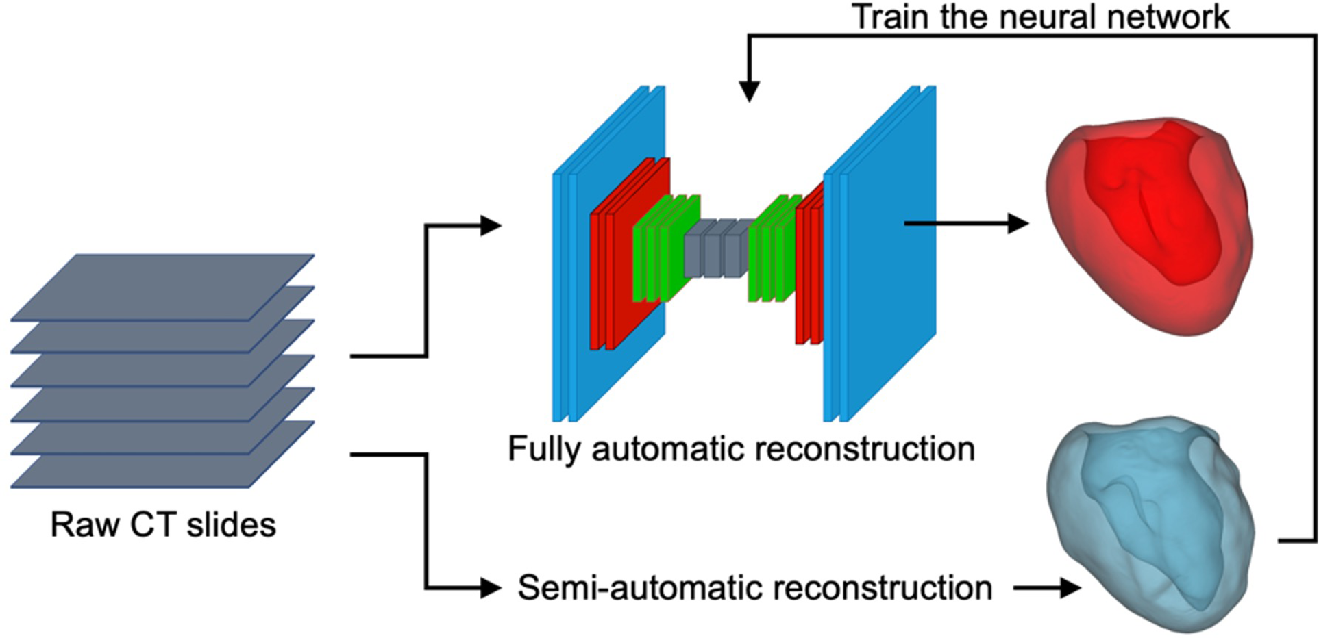 Schematic representation of the U-Net neural network, semi-automatic segmentation of the LV using 3D-Slicer (blue), and a sample AI-predicted reconstructed LV geometry (red).