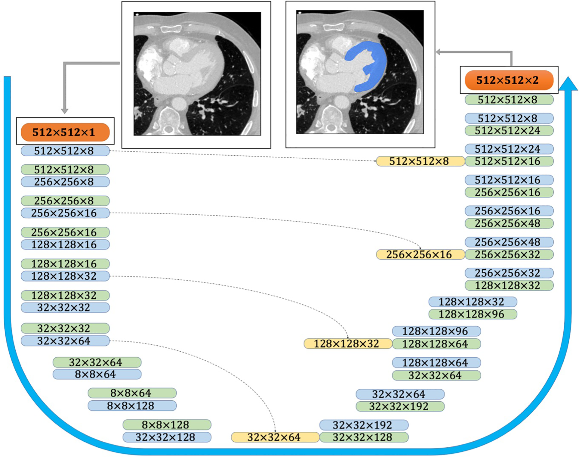 CNN architecture used for semantic image segmentation. The input and output images are shown as orange boxes. The inputs and outputs of the CNN layers are shown as green and blue boxes, respectively. The yellow boxes represent the copied tensors, and the blue arrow indicates the flow of the CNN model from raw input image to the binary segmented output image.