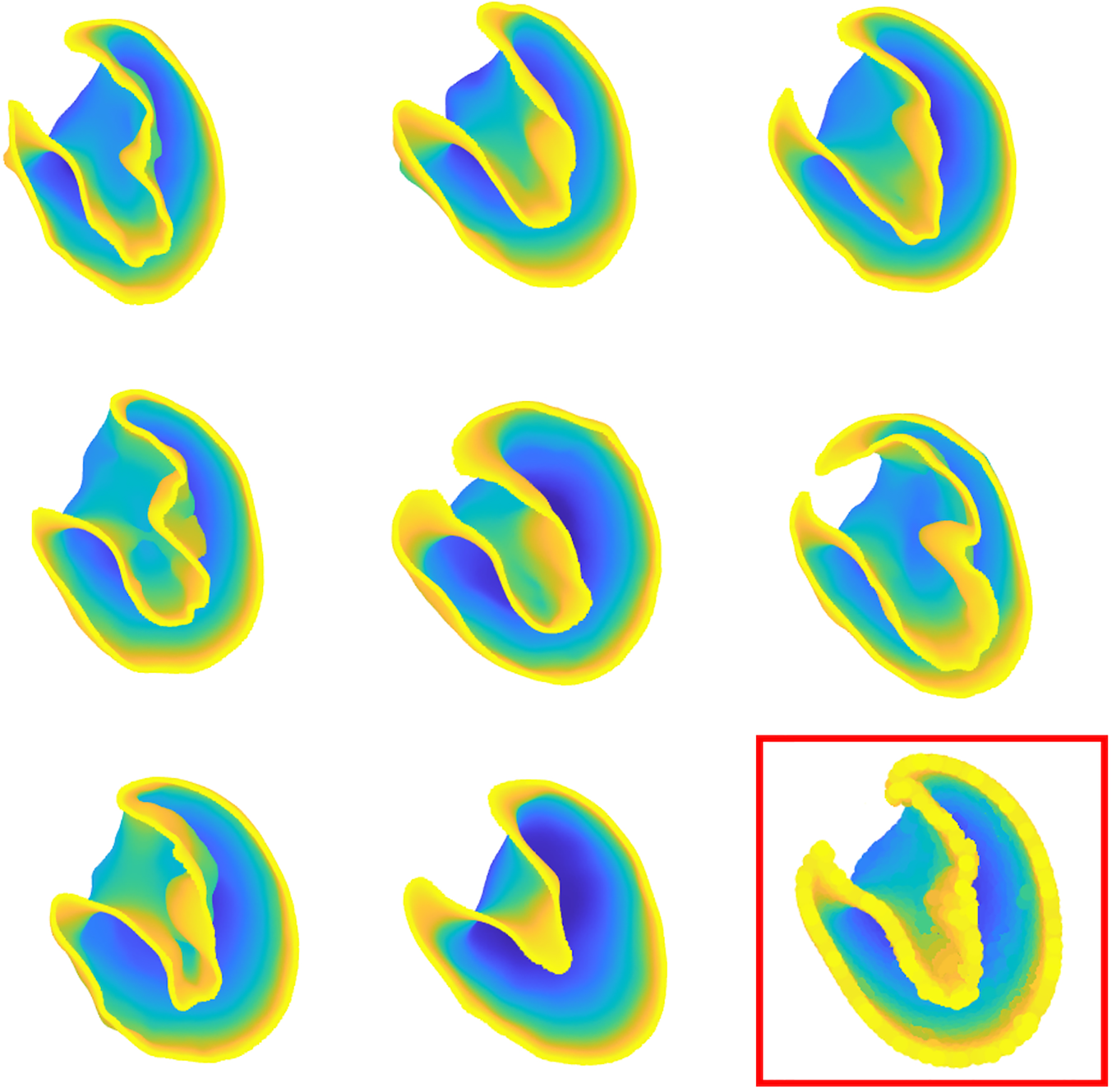 Some of 66 patient-specific left ventricle shapes after processing and preliminary operations. The template shape is indicated in the bottom right of the figure.