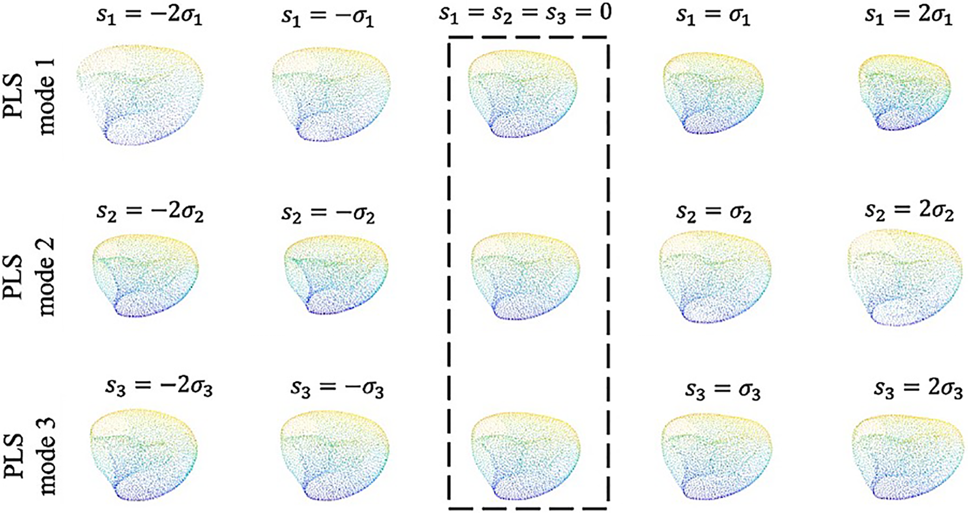 We successfully developed CT-image based SSMs to perform the prediction task based on extracted shape features. LV shapes were generated after denoising, down-sampling, and alignment along the average shape (Figure 4). Moreover, SSMs allowed us to analyze LV shapes by visualizing the most important modes identified by the PLS, as followingly described.