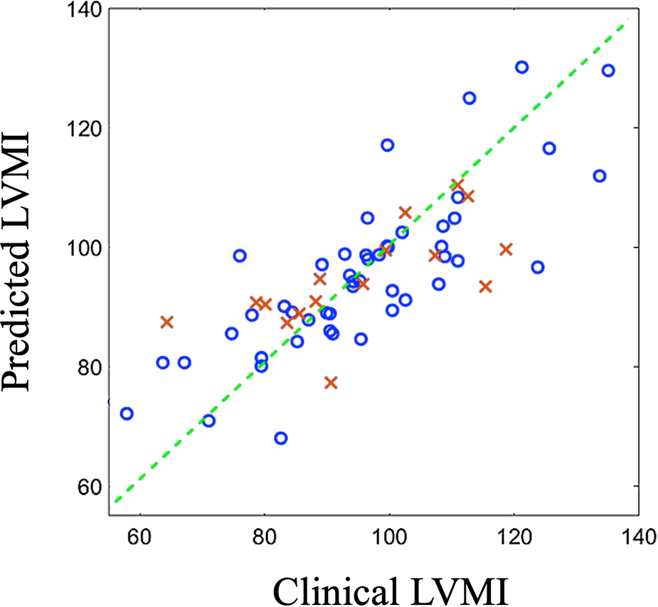 Predicted outcomes (vertical axis) vs clinically reported outcomes (horizontal axis) for train data (blue circles) and test data (red crosses). LVMI: Left ventricle mass index.