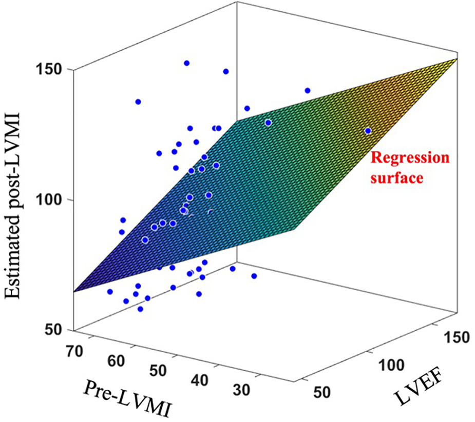 Applying linear regression surface to estimate post-LVMI based on clinically measured LVEF and pre-LVMI.