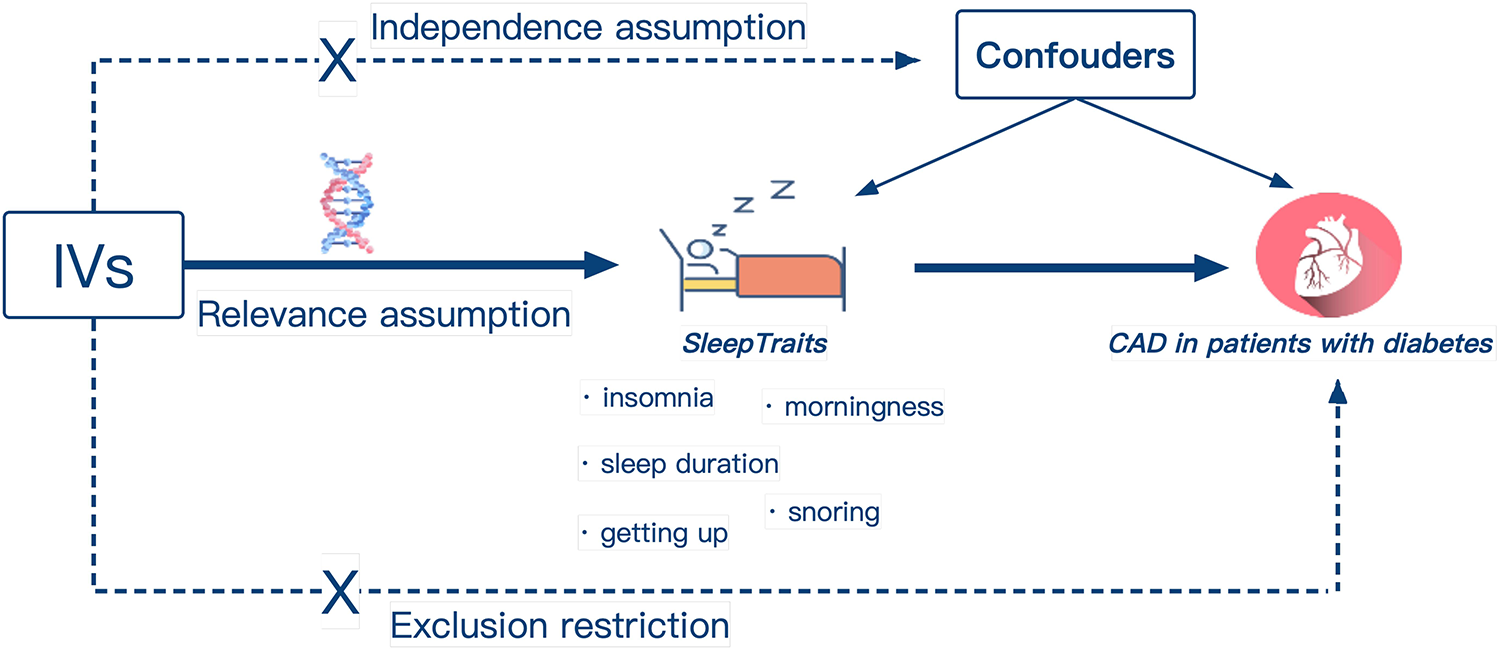 Design of the Mendelian randomization study. Three core assumptions were as follows: Relevance assumption, the genetic IVs must be associated with sleep traits; Independence assumption, IVs should not be associated with confounders; Exclusion restriction, IVs must influence CAD in patients with diabetes only via sleep traits. IVs, instrumental variables; Easy to get up, ease of getting up in the morning; CAD, coronary artery disease.