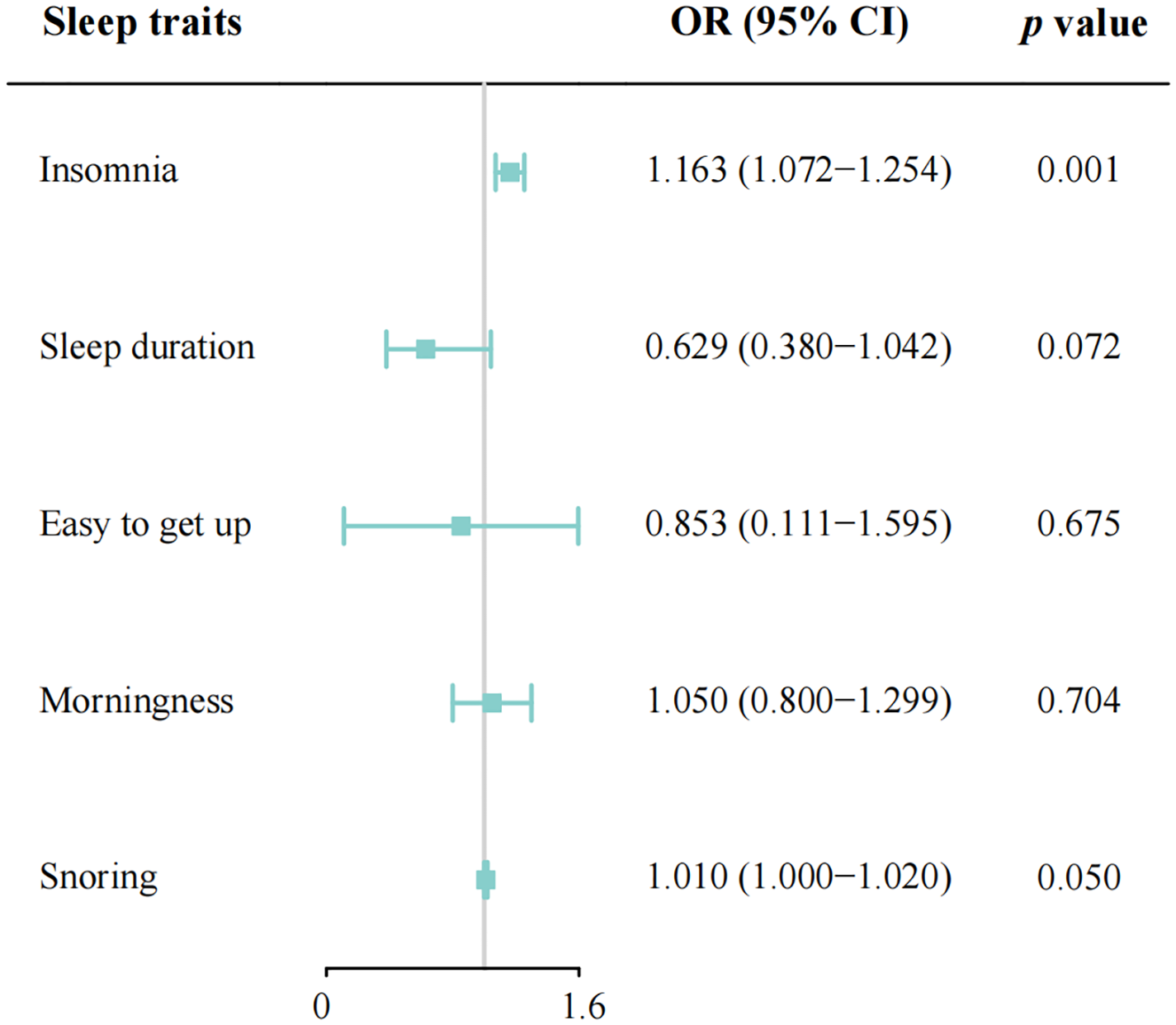 Genetic liability to insomnia was significantly related to the increased risk of CAD in individuals with diabetes [odds ratio (OR): 1.163; 95% CI: 1.072–1.254; p = 0.001]. Suggestive evidence was found for the borderline associations between both sleep duration (OR: 0.629; 95% CI: 0.380–1.042, p = 0.072) and snoring (OR: 1.010, 95% CI: 1.000–1.020, p = 0.050) with CAD risk. However, no consistent evidence was found for the association between ease of getting up and morningness with the risk of CAD in diabetic. Similar results can be verified in most sensitivity analyses.