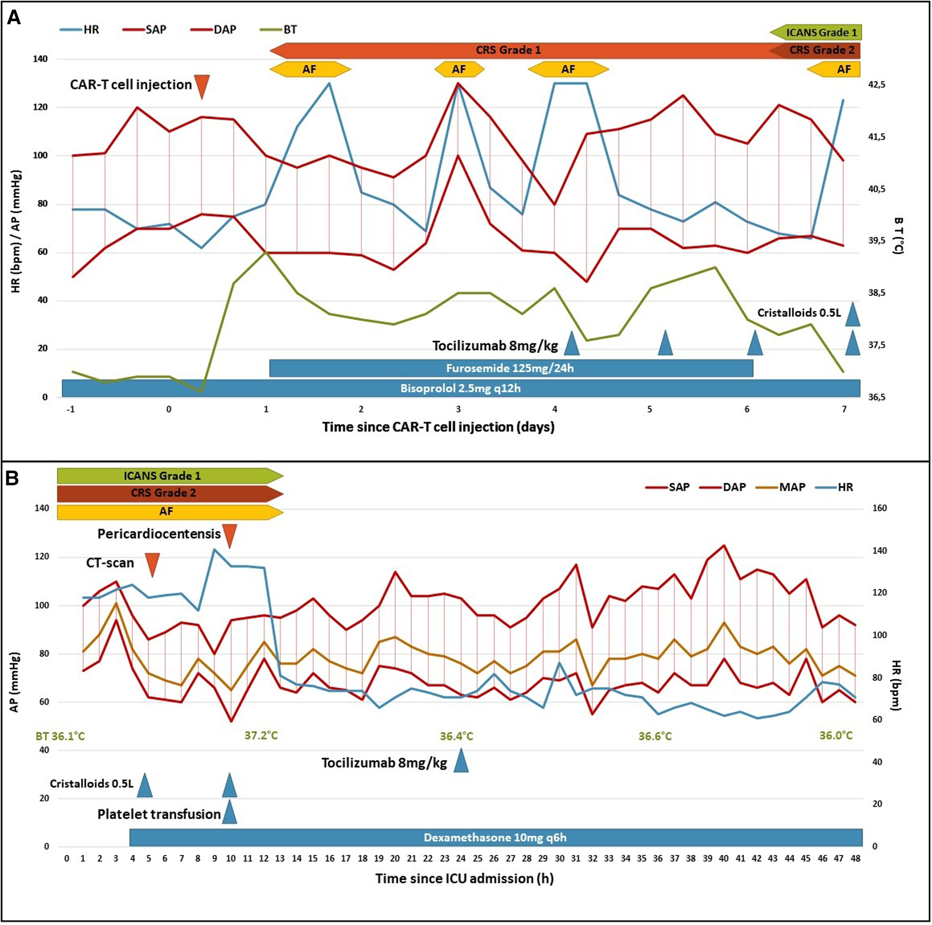 Clinical course following CAR-T cell injection (A) and ICU admission (B). AF, atrial fibrillation; AP, arterial pressure; BT, body temperature; CRS, cytokine release syndrome; DAP, diastolic AP; HR, heart rate; ICANS, immune effector cell-associated neurotoxicity syndrome; ICU, intensive care unit; MAP, mean AP; SAP, systolic AP.