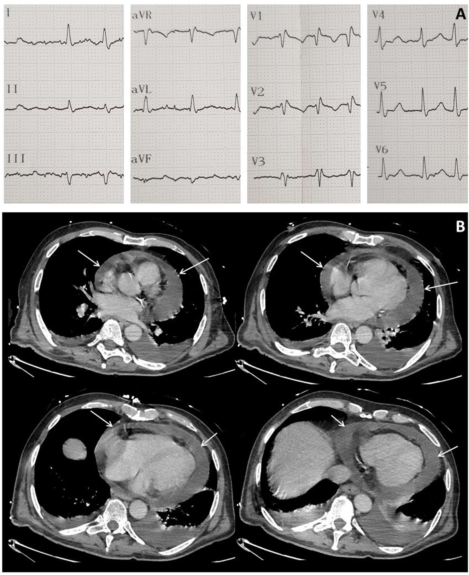 Electrocardiogram at ICU admission showing atrial fibrillation and right bundle branch block (A) and computed tomography performed after CAR-T cell therapy showing major circumferential pericardial effusion (arrows) (B).