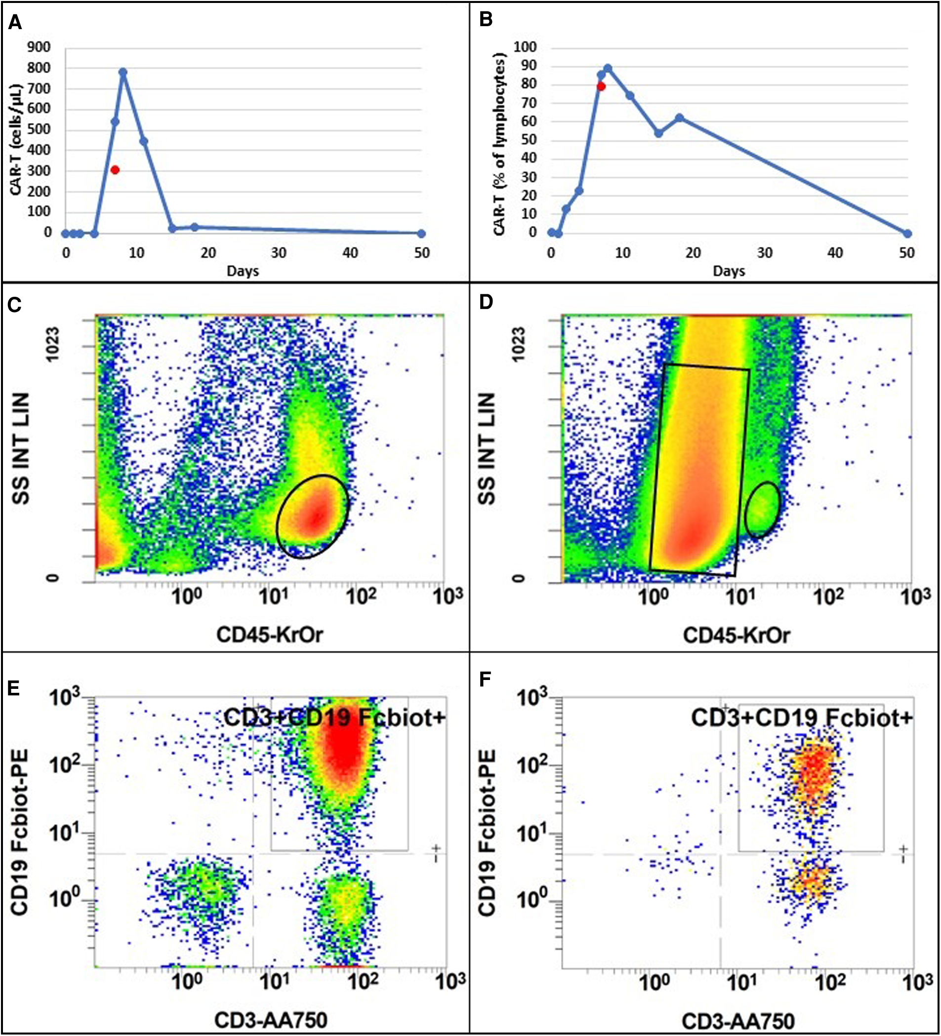Evolution of CAR-T cell absolute number (A) and percentage of total lymphocytes (B) following injection, in blood (blue dots and line) and in pericardial fluid (red dot). Flow cytometry analysis of blood (C) and pericardial fluid (D) according to size (SS INT LIN) and CD45 expression (CD45-KrOr). Black ovals represent lymphocyte population. The black rectangle represents lymphoma population only present in pericardial fluid. Among lymphocyte population, CAR-T cells were selected according to CD3 and CD19 Fc-biotine expression in blood (E) and pericardial fluid (F). Colors from blue to red indicate an increase in cell count.